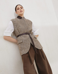 Charming flecked chevron pairs perfectly with the British appeal of this virgin wool and silk vest. With a sartorial allure, the garment features a stand collar detailed with a contrasting undercollar, for a refined color combination, while the leather belt, a reference to the equestrian world, harmoniously highlights the waist, gathering the silhouette’s volume. A fine row of shiny monili, the iconic embellishment of the Brunello Cucinelli collections, completes the vest with a delicate sparkling note. MATERIALS The flecked virgin wool and silk chevron stands out for its elegant herringbone design, enhanced by the refined irregularity of the flecked yarn. Soft and substantial, the hand reflects the warm texture of wool and the sophisticated sheen of silk. DETAILS Horn button closure Silk-blend crepe lining Peak lapel Welt pockets with flap and chest pocket Single back vent Detachable belt Nickel-free monili decoration 73% VIRGIN WOOL, 22% SILK, 5% NYLON