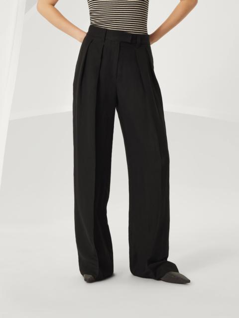 Refined Brunello Cucinelli materials enrich the casual volume of these baggy trousers. Inspired by classic five-pocket denim designs, the garment features a relaxed cut in the seat and down the leg, complemented by the crisp, lightweight texture of viscose and linen fluid twill. A delicate shiny monili embroidery on the rear belt loop adds a note of feminine sparkle. MATERIALS The blend of viscose and linen gives the twill a lightweight, very fluid appearance that is semi-crisp at the same time. DETAILS Zip closure with button Front pockets with watch pocket Pleat Back patch pockets Plain hem Nickel-free monili decoration 72% VISCOSE, 28% LINEN
