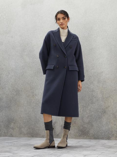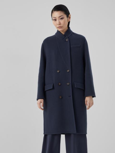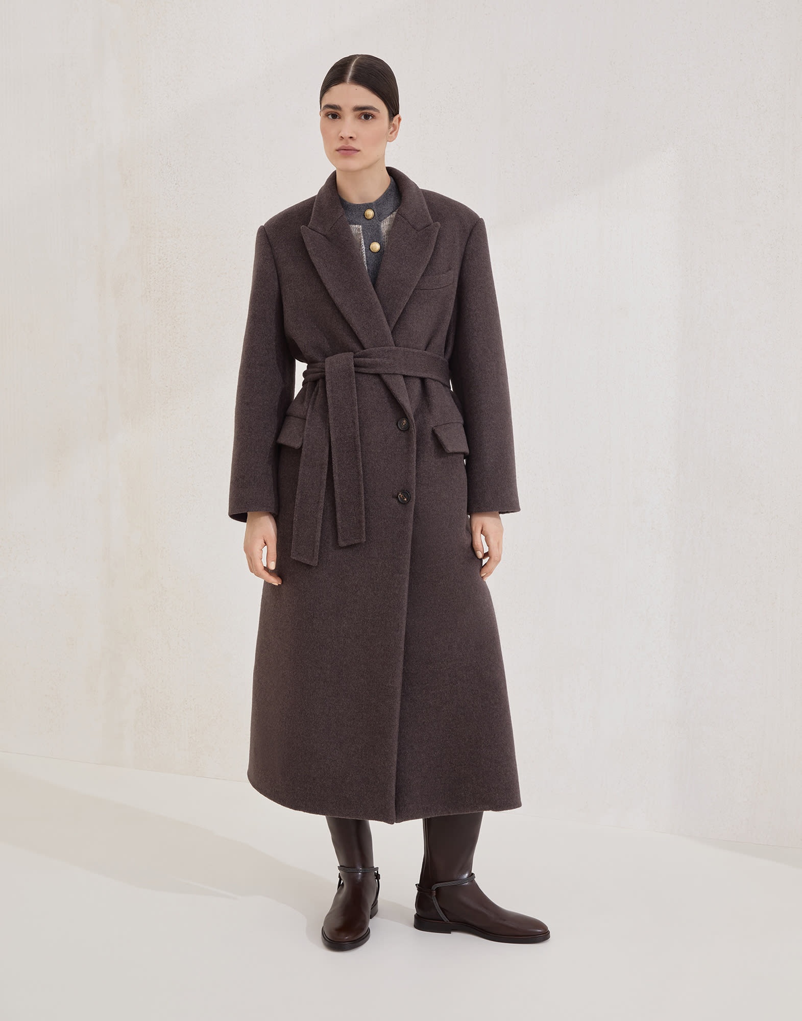 Refined materials and sophisticated workmanship come together in this new hand-crafted coat. The soft virgin wool and cashmere cloth is crafted with two layers of fabric that are bonded together to create a garment with a plush, cozy texture. The silhouette features a slightly oversized cut, highlighted by the generous shoulders, pronounced lapels and double-breasted closure, while the belt gathers the volume to accentuate the waist in a balanced way. The monili detail, the iconic embellishment of the Brunello Cucinelli collections, introduces a delicate note of feminine sparkle. MATERIALS Special manufacturing creates the virgin wool and cashmere hand-finished fabric: two fabrics are simultaneously created on a loom using a construction with ultra fine threads that unites them along the entire surface. The material is thin, lightweight, and, at the same time, soft and cozy. DETAILS Horn button closure Half-lined in silk-blend crepe Peak lapel Chest pocket Hand pockets with flap Detachable tie belt Vent at bottom Nickel-free monili decoration 90% VIRGIN WOOL, 10% CASHMERE
