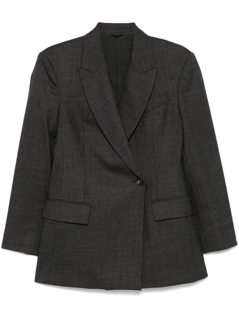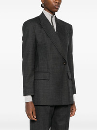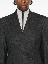 double-breasted blazer Highlights - Dark grey - Virgin wool blend - Interlock weave - Double-breasted button fastening - Peak lapels - Shoulder pads - Long sleeves - Buttoned cuffs - Chest welt pocket - Dart detailing - Two side flap pockets - Central rear vent - Partial lining - Straight hem Made in Italy Composition Lining: Acetate 74%, Silk 26% Outer: Virgin Wool 98%, Elastane 2% SIZE & FIT Model measurements Height 5 ft 10 in(1.78 m) Bust/Chest 31.49 in(80 cm) Hips 37 in(94 cm) Waist 23.62 in(60 cm) FittingInformation Designed for a slim fit that sits just away from the body offering a close yet comfortable fit The internal shoulder pads offer a structured shape Made from a midweight fabric