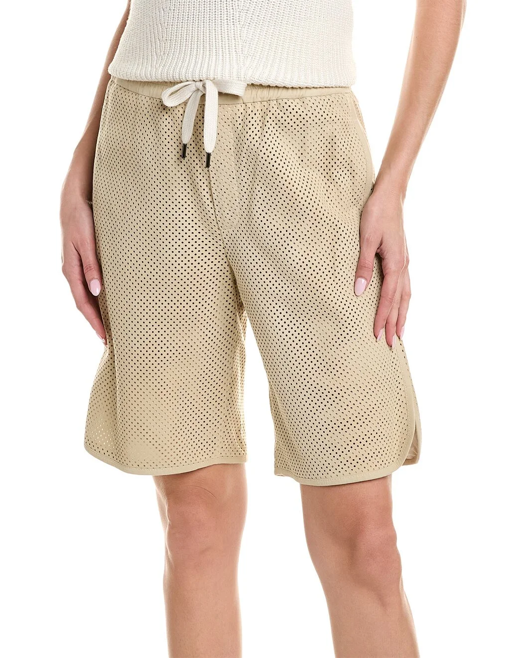 - About the brand: Hailed for its beautifully-crafted cashmere pieces, Brunello Cucinelli was named GQ's Designer of the Year in 2021. With attention to craftsmanship and sustainability, the company exemplifies Italian luxury. - Short in beige with perforated design, dual side on-seam pockets, dual back welt pockets, and elasticized drawstring waistband - Inseam approximately 10in; 11.5in rise - Model is 5'10 and is wearing a size 40. Measurements may vary slightly by size. - Slip-on styling - 100% leather - Clean by a leather expert - Made in Italy - Our products are 100% genuine. In some cases we purchase merchandise from trusted independent suppliers and not directly from the brand owner. In all cases we stand by the authenticity of every product sold on our site.