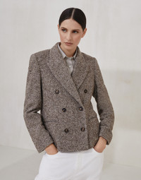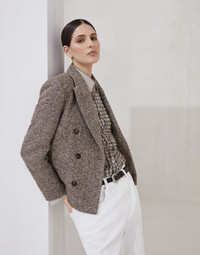 Effortless tailored style defines this new virgin wool and silk melange diagonal blazer. Inspired by classic masculine elegance, the peak lapels and double-breasted closure are paired with a cropped silhouette, adding a contemporary, feminine allure. A precious monili embroidery, the iconic embellishment of the Brunello Cucinelli collections, completes the blazer with a very sophisticated and unexpected sparkling touch. MATERIALS The virgin wool and silk melange diagonal stands out for its angled weave and the typical textured effect of melange yarn. Compact and structured, the fabric maintains the garment’s shape, while the softness of wool blends with the natural sheen of silk, creating a sophisticated balance between comfort and elegance. DETAILS Horn button closure Silk-blend crepe lining Peak lapel Welt pockets and chest pocket Nickel-free monili decoration 73% VIRGIN WOOL, 22% SILK, 5% NYLON