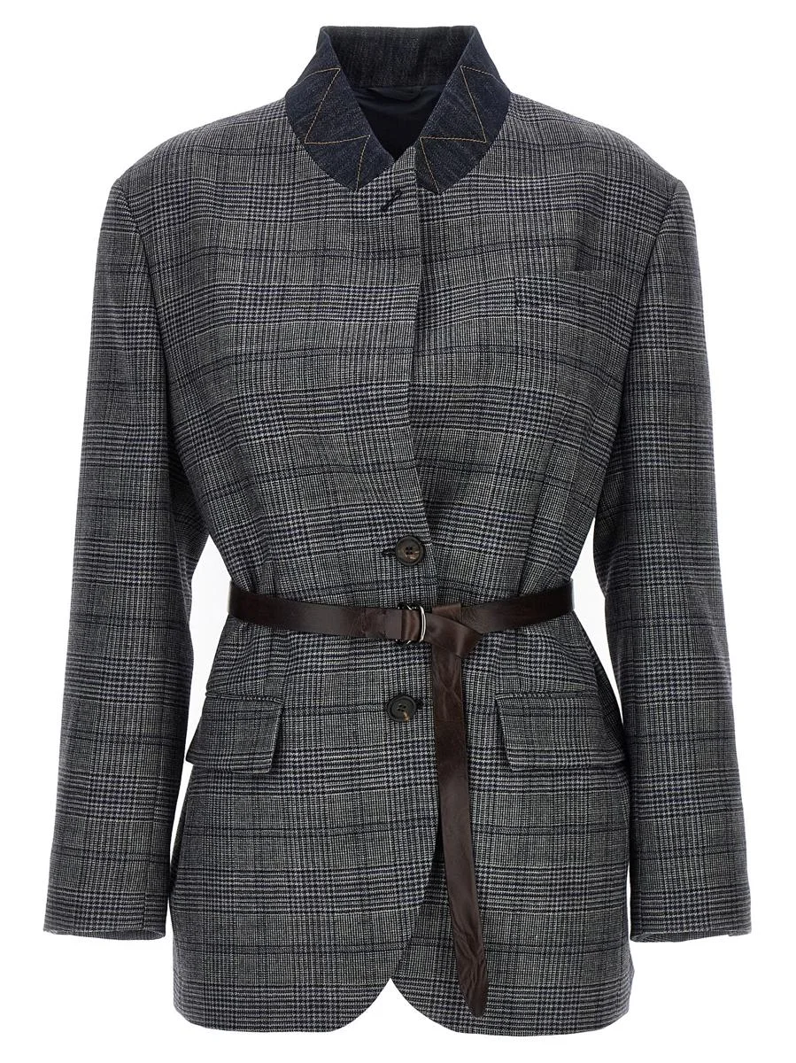 Deconstructed single-breasted houndstooth wool blazer with front button closure, cotton denim collar with contrast stitching and back Monile detail, breast pocket, flap pockets, long sleeves, back split, unlined, removable leather belt Gender: Women Material: 100% VIRGIN WOOL Color: GRAY Made in: Italy Product ID: MG5227391PC4227 *Import tax/duty will be calculated at checkout (If applicable)