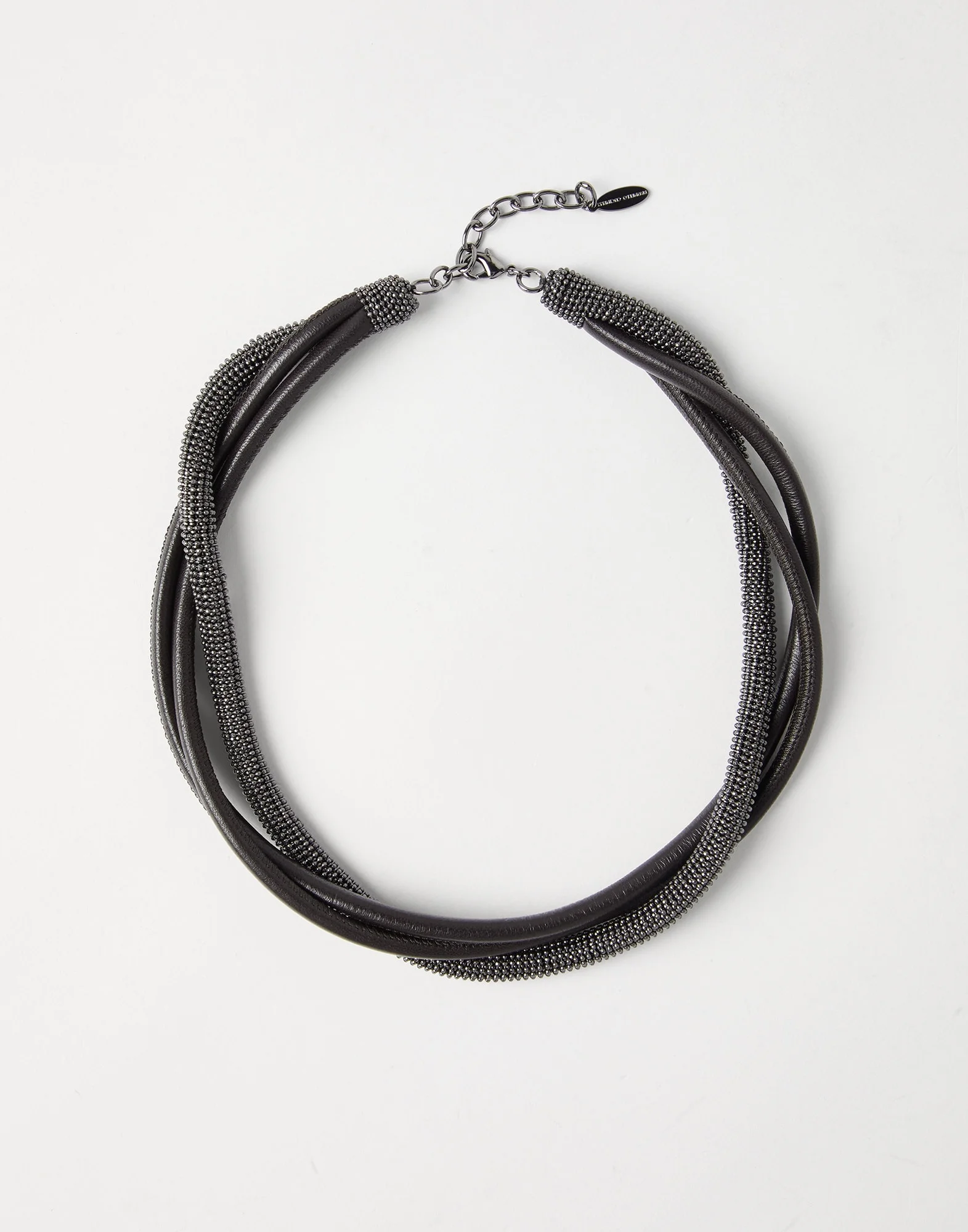 Ethnic inspirations and precious materials enrich the new leather Precious choker necklace. The fine matte-effect leather pairs perfectly with the shiny reflections spread by rows of monili, the iconic embellishment of the Brunello Cucinelli collections. The accessory is complemented by a hook closure that is adjustable to different lengths. MATERIALS The necklace features tubular strips of leather paired with shiny monili, the iconic element of the Brunello Cucinelli collections. Fine rows of beads, crafted with a faceted cut to emphasize shiny reflections, make up the monili. All metal parts are coated with precious materials that completely replace Nickel, enriching the excellence of every single detail. DETAILS The maximum length of the necklace is approximately 45 cm Adjustable length closure clasp All metal parts are Nickel-free