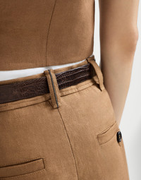 This linen diagonal sartorial skirt reinterprets the codes of masculine elegance with refined simplicity. The garment features deep pleats at the top that flow down the straight silhouette with a distinctly feminine allure. The slits create a light, airy look, while the iconic shiny monili embroidery adds a delicate sparkle in true Brunello Cucinelli style. MATERIALS Linen diagonal combines the freshness and elegance of the natural fiber with a twill-weave, enriching the fabric with a refined diagonal texture. This combination gives the material strength, breathability and an attractive irregular hand. DETAILS Zip closure with button Vertical front pockets Double pleat Back welt pockets with button Side vents at bottom Nickel-free monili decoration 100% LINEN