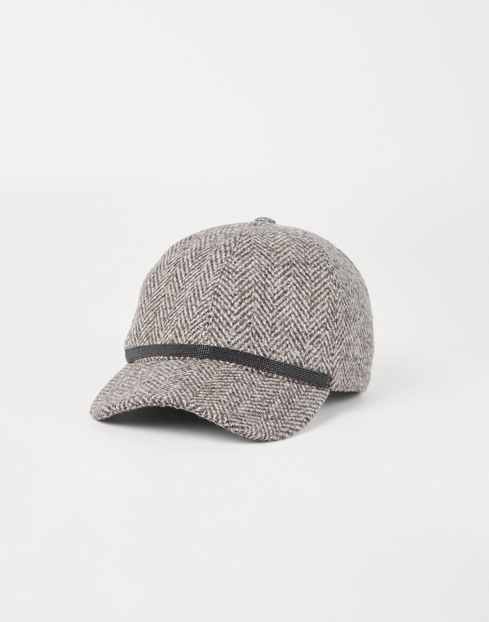 British-inspired virgin wool tweed elevates the elegant, casual feel of this new baseball cap. An embroidered band of rows of shiny monili, the iconic embellishment of the Brunello Cucinelli collections, adds a precious, feminine touch to the accessory’s visor. MATERIALS The virgin wool tweed is a warm, resistant fabric, characterized by a slightly irregular surface and a substantial hand. Traditionally associated with the style of British menswear, it stands out for its textured appearance and the typical slightly melange chevron design. DETAILS Reinforced brim Adjustable leather strap with buckle Crepe lining Nickel-free monili decoration 73% VIRGIN WOOL, 27% NYLON