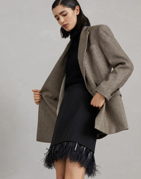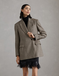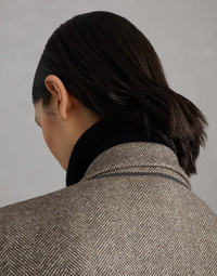 Crafted from refined techno wool, this carded chevron blazer updates a timeless icon of retro style. The model draws inspiration from the world of tailoring and showcases a slightly oversized fit with generous shoulders, harmoniously balanced with a regular waist. The precious monili detail adds a delicate sparkle. MATERIALS The chevron pattern enhances the structured texture of the refined techno wool fabric. The noble qualities of the natural fiber, such as softness and breathability, are paired with a small percentage of synthetic fibers to preserve the structure of the natural thread. The silk-blend lining finishes the garment and makes it comfortable to wear. DETAILS Horn button closure Peak lapel Silk-blend crêpe lining Chest pocket Hand pockets with flap Cuffs have four horn buttons Single back vent Nickel-free monili decoration 51% VIRGIN WOOL, 36% WOOL, 12% NYLON, 1% ELASTANE