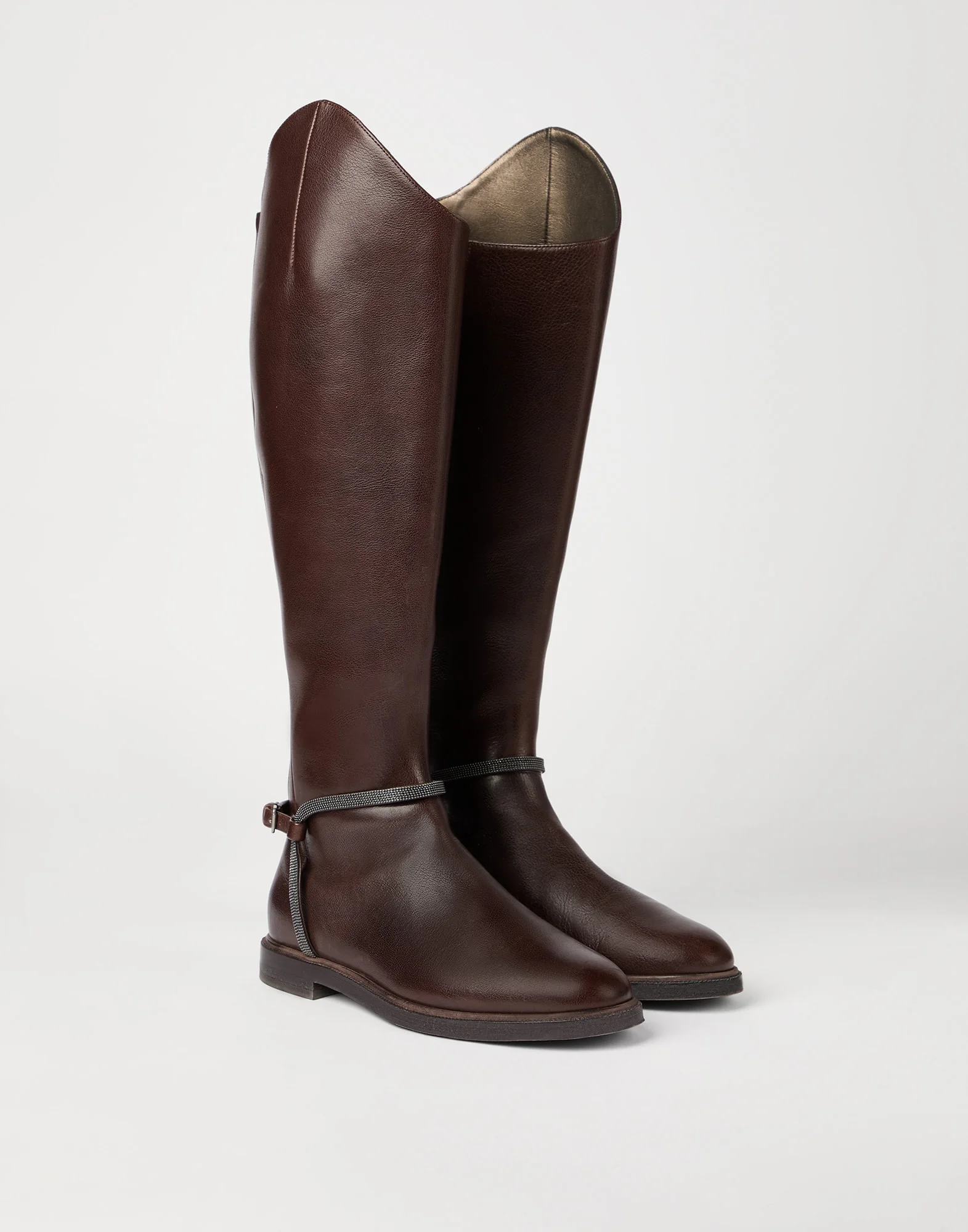 A new design enriches the Brunello Cucinelli boots line. These Classic leather boots feature a silhouette inspired by the Equestrian world: the high and slim asymmetric shaft perfectly wraps around the leg, enhancing it with understated and sophisticated elegance. The slightly rounded toe and flat heel strike a harmonious balance between functionality and refinement. A precious monili detail at the ankle adds a distinctive sparkling note. MATERIALS The classic leather features a fine natural grain that defines the texture with a smooth, compact and semi-polished effect. The leather lining, thin leather outsole and rubber sole provide a comfortable fit. DETAILS Back zip closure Leather lining Leather sole Rubber outsole Nickel-free monili decoration REAL LEATHER