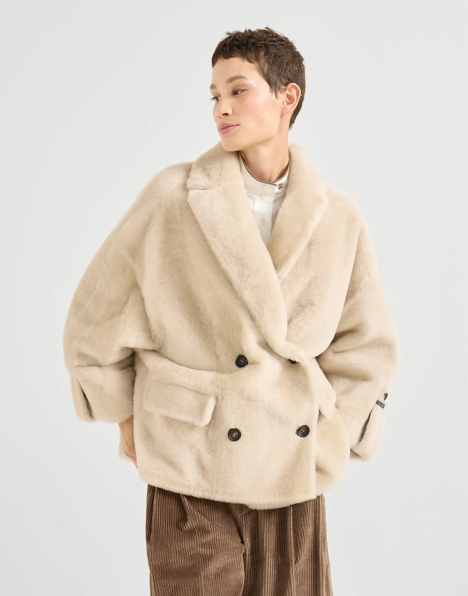 Refined Brunello Cucinelli materials enrich this new reversible shearling outerwear jacket. The garment features a soft and cozy surface on the one side, alternating with a compact, Nappa-effect texture on the other side, conveying versatile and textural elegance. The voluminous silhouette is enhanced by large lapels and the double-breasted closure. A precious monili insert illuminates the sleeves with an elegant feminine note. MATERIALS Manufacturing of the soft leather provides a very supple and regular final effect. The reverse side is characterized by a pleasant, slightly nappa-like look. DETAILS Horn button closure Inner side in leather Notched lapel Hand pockets with flap Cuffs with horn button Nickel-free monili decoration SHEARLING