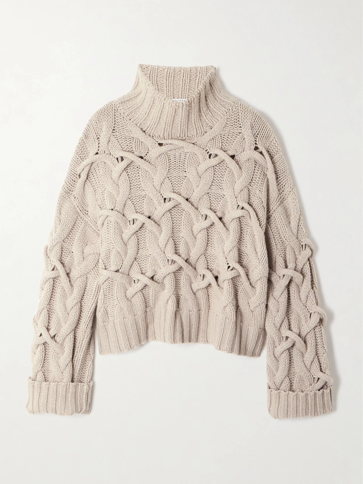 Brunello Cucinelli's sweater has a unique interlocking cable-knit finish that gives it a cool 3D effect. It's made from soft cashmere and has a chunky turtleneck and ribbed trims. Wear yours with a pair of the label's relaxed tailoring.