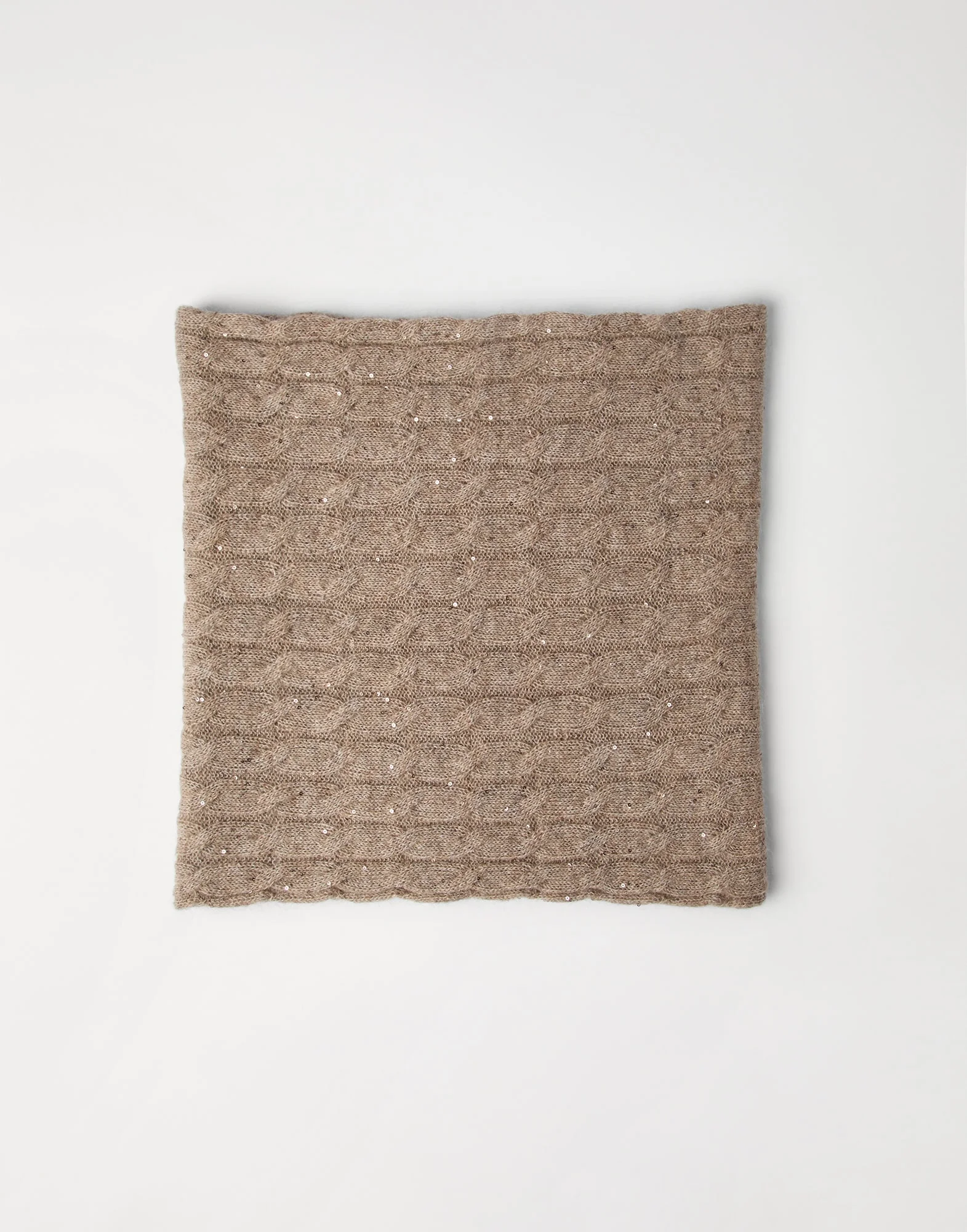 Refined Brunello Cucinelli yarns enhance the sense of warmth and coziness of this new Dazzling mohair knit neck warmer. The surface of the accessory is entirely covered in sparkling sequins that lend a shiny and feminine appearance. MATERIALS The accessory is characterized by the soft and airy texture of mohair, enhanced by a delicate sequin thread, for a sparkling effect. DETAILS Plain stitch 38% MOHAIR, 28% NYLON, 16% COTTON, 10% WOOL, 8% POLYESTER