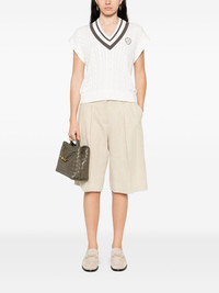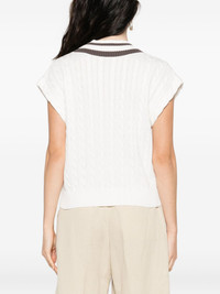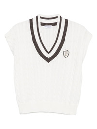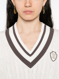 cable-knit V-neck vest Highlights - White - Cable knit - V-neck - Brown trim - Short sleeves - Emblem patch Made in Italy Composition Cotton 100% SIZE & FIT Model measurements Height 5 ft 9 in(1.75 m) Bust/Chest 32.67 in(83 cm) Hips 36.22 in(92 cm) Waist 24.8 in(63 cm) Washing instructions Hand Wash