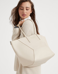 This calfskin shopper bag reinterprets the classic "everyday bag" in true Brunello Cucinelli style. With an ultra-soft hand, the leather enhances the accessory’s contemporary feel, highlighted by bold stitching that emphasizes the squared, minimal lines. A removable internal zipper pouch and the practical magnetic closure complete the style, while two monili embroideries add a feminine, sparkling note. If fastened, the internal ties on the sides allow the shape of the bag to change, making it more compact. MATERIALS Calfskin leather showcases a smooth, soft and even texture. The surface’s slightly matte appearance brings out the colors of the season with an intense, rich effect. DETAILS Magnetic snap closure Double handle Leather lining Internal pocket with zip closure Nickel-free monili decoration Bag is 53 cm (20.87”) long, 27 cm (10.63”) high, 25 cm (9.84”) wide 100% REAL LEATHER