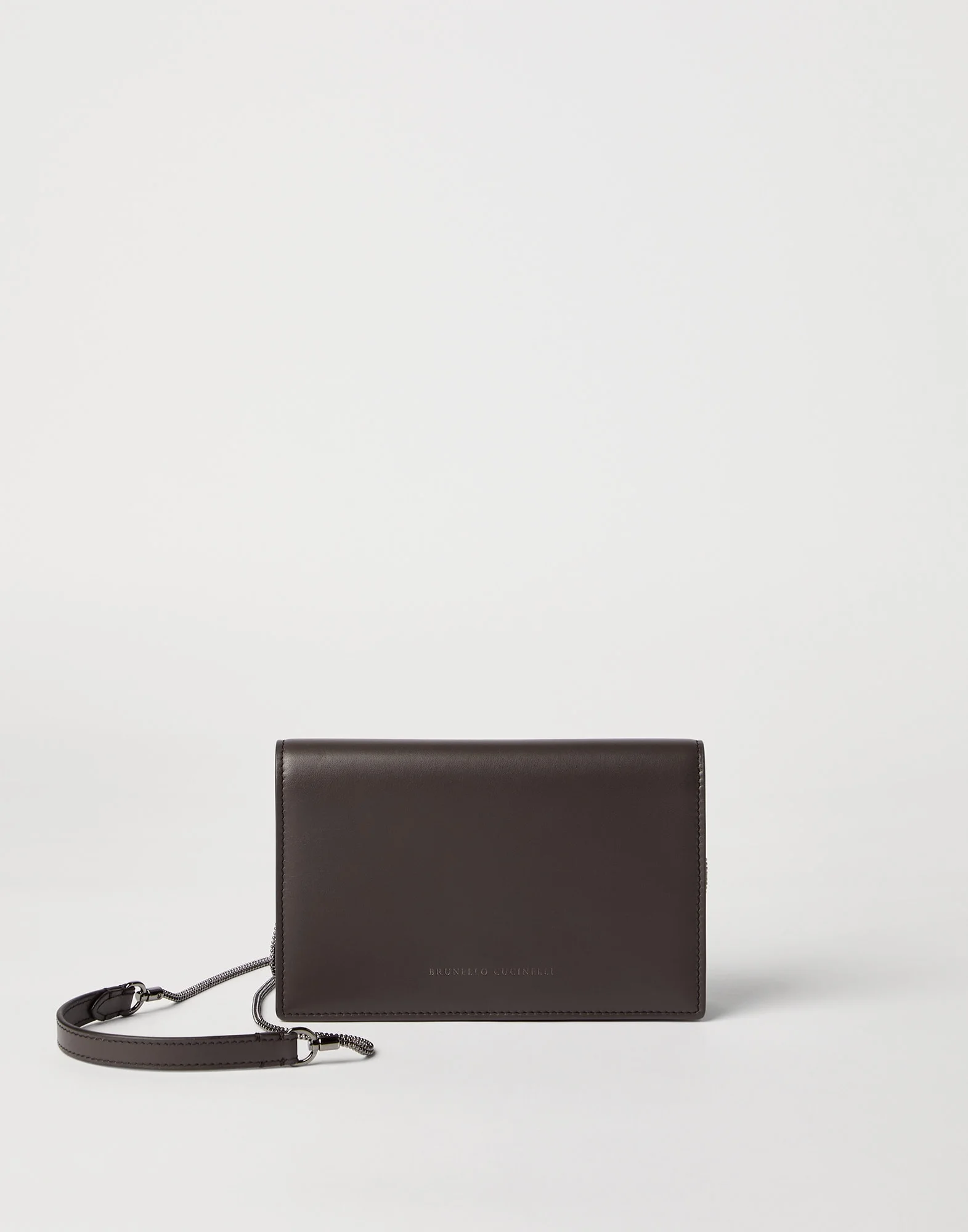 Refined materials and iconic details define the style of this calfskin wallet. Soft and compact, the leather complements the accessory’s essential, functional design and highlights the season’s colors. Equipped with several compartments for cards and bills, as well as a zipper coin purse, the wallet is completed by a removable precious monili shoulder strap, enriching the design with a sparkling touch in true Brunello Cucinelli style. MATERIALS The refined calfskin showcases a smooth, soft and even texture. The leather’s matte appearance brings out the season’s colors with an intense, rich effect. DETAILS Magnetic snap closure Detachable shoulder strap Leather lining Coin purse with zip closure 6 slots for cards and business cards Nickel-free monili decoration Accessory is approx. 19 cm long, 12 cm high and 4,5 cm wide REAL LEATHER