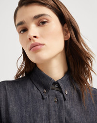 A combination of sporty inspirations and summery materials defines the style of the new denim-effect twill dress. The informal feel of chemisier dresses meets a feminine silhouette: the top features two chest pockets and a shirt collar, classic shirting elements, while the practical belt gathers volumes and marks the waist. A monili detail on the collar complements the garment with a sparkling touch, in pure Brunello Cucinelli style. MATERIALS Characterized by a look reminiscent of classic denim, the pure cotton twill is a lightweight, comfortable fabric, suitable for wearing during the warmer months. DETAILS Half-length opening with mother of pearl buttons Button-down collar Two chest pockets Detachable ring belt Front pockets Nickel-free monili decoration 100% COTTON
