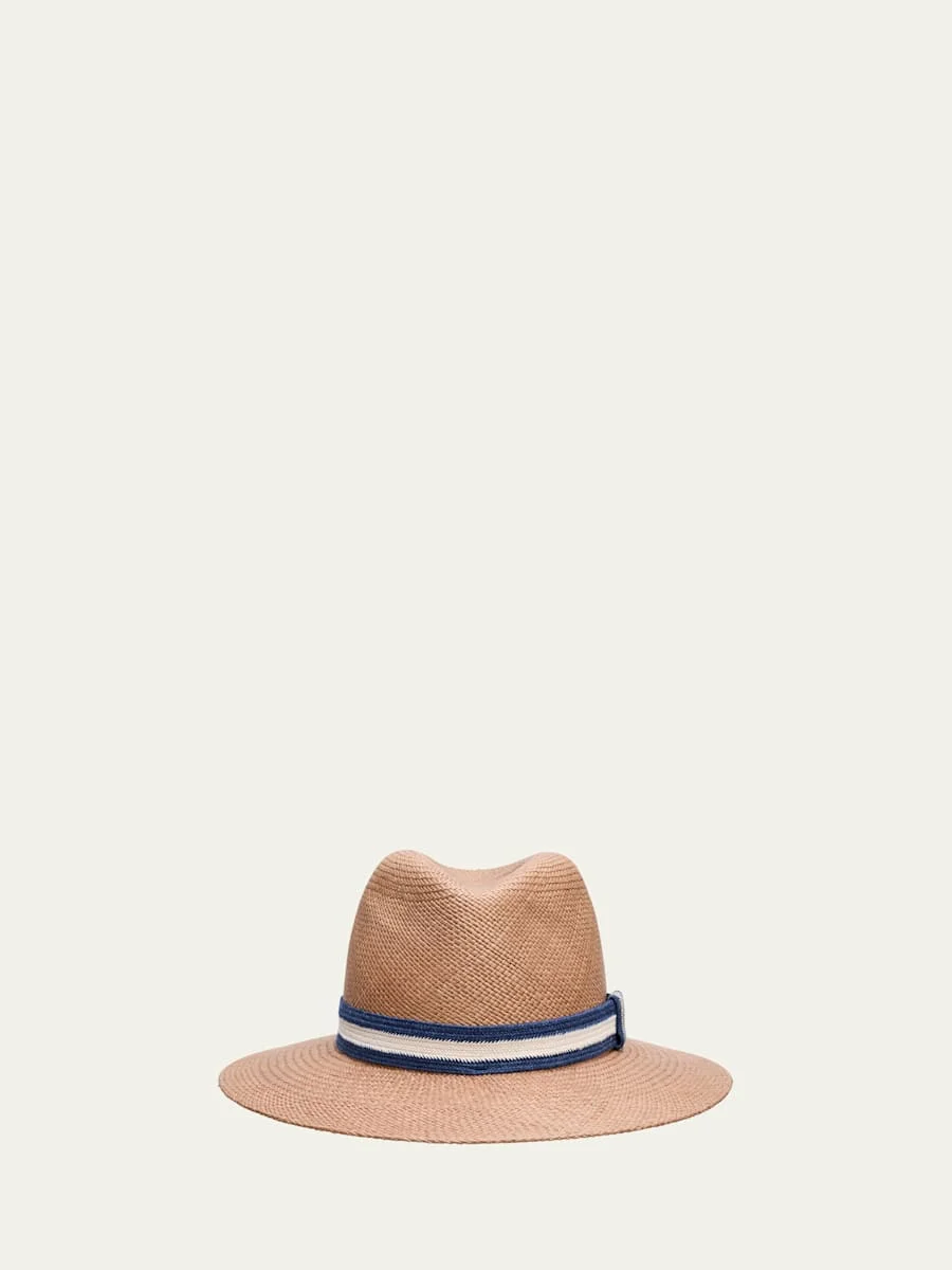 A versatile essential, this woven fedora from Brunello Cucinelli features a structured pinched crown and a striped grosgrain ribbon with a monilitrimmed tab. Pinched crown Wide brim Straw/brass/raffia Made in Italy
