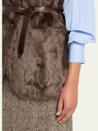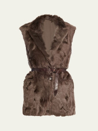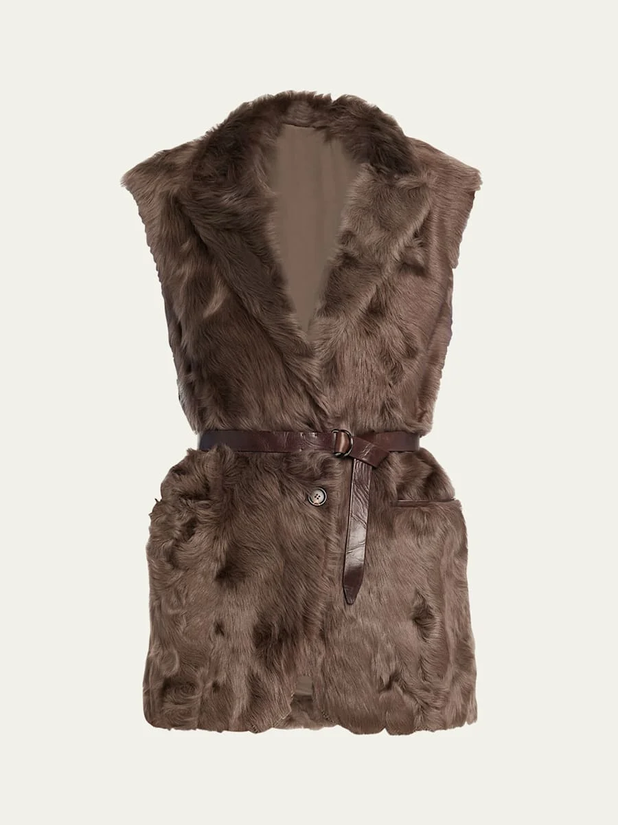Brunello Cucinelli vest in matural and dyed capretta lamb shearling (Portugal) with a leather belted waist and monili embellished back of the neck Peak lapels; singlebreasted front Sleeveless Belted waist Hip patch pockets Straight fit Hem falls below the hip Centerback vented hem Shearling/leather Lining: Silk/acetate Dry clean Made in Italy