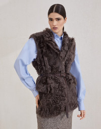 This new wavy shearling vest stands out for its distinctive, bold appearance. The material’s textured, deliberately irregular look is paired with the garment’s impeccable sartorial charm, creating an unexpected combination of style. A reference to the equestrian world, the leather belt gathers the silhouette’s volume, highlighting the waist in a harmonious way. A fine row of shiny monili, the iconic embellishment of the Brunello Cucinelli collections, completes the vest with a delicate feminine sparkle. MATERIALS The carefully ironed wool creates elegant effects of intensity that enhance the depth of the collection’s colors. The silk-blend crepe lining completes the garment and provides added comfort. DETAILS Horn button closure Silk-blend crepe lining Notched lapel Chest pocket Hand pockets with flap Detachable ring belt Single back vent Nickel-free monili decoration 100% FUR