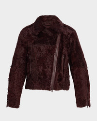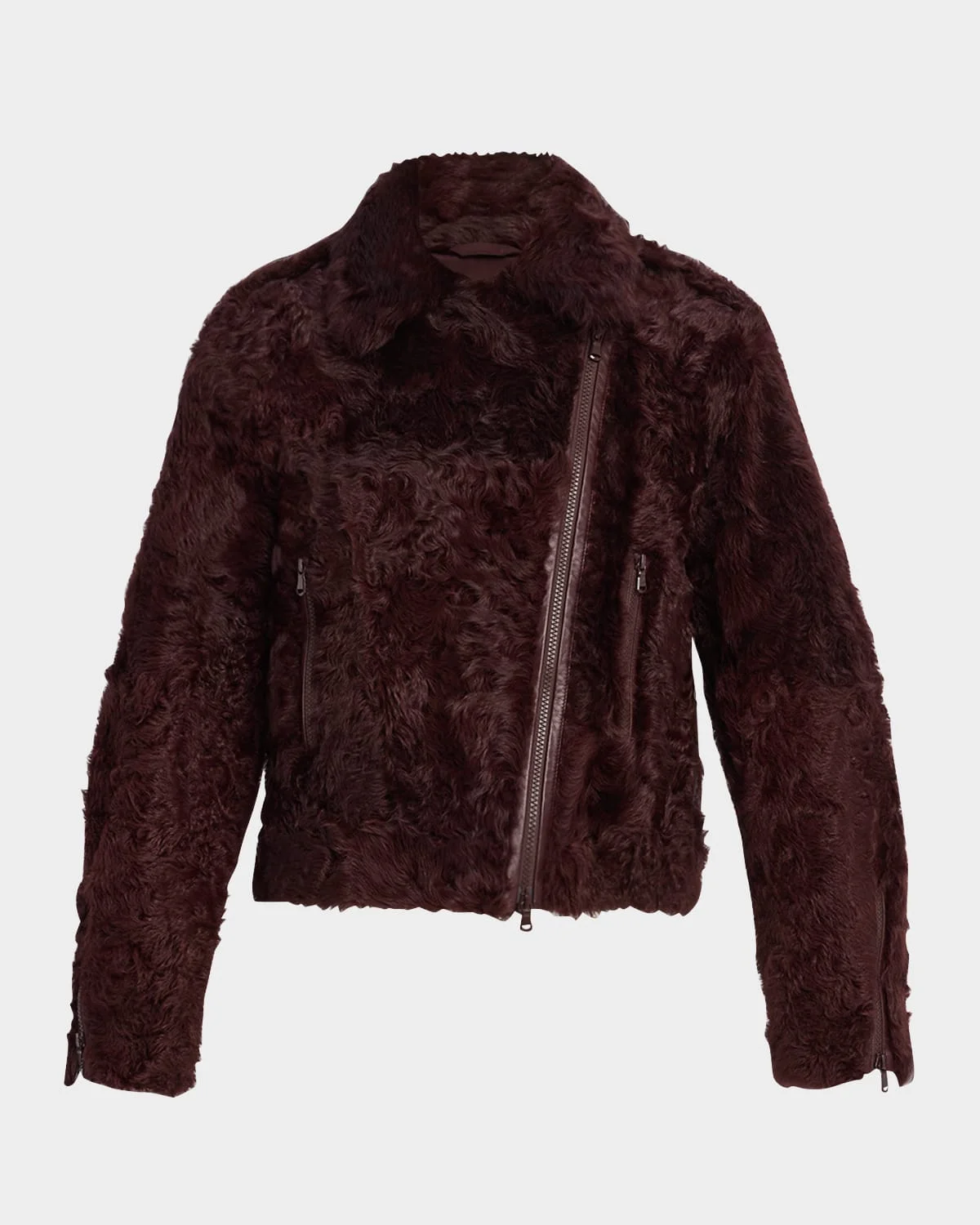 - Brunello Cucinelli moto jacket in natural and dyed capretta sheep shearling (China) and sheepskin leather trim - Features a monili tab on the hip - Nothc lapels; off-center zip front - Long sleeves; zip cuffs - Straight fit - Hip length - Shearling/leather - Made in Italy