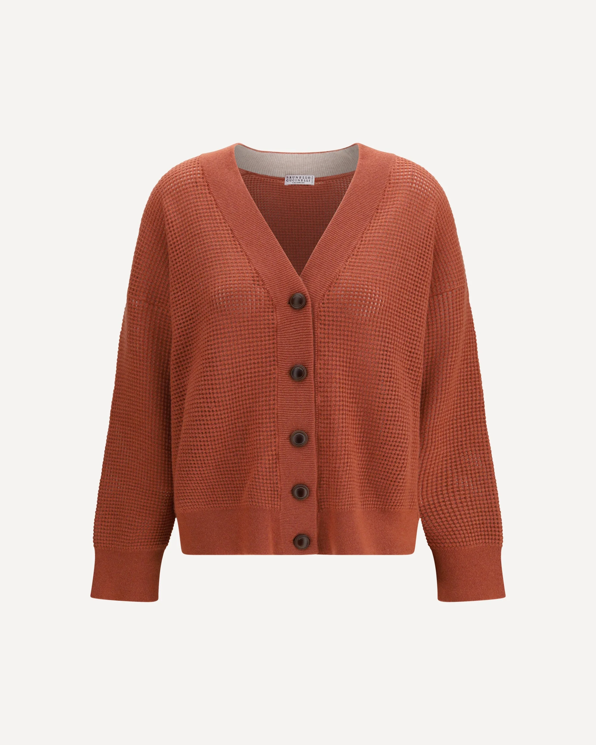The Cardigan in cashmere with V-neck by Brunello Cucinelli embodies softness and refined elegance in a relaxed silhouette. Crafted from mesh-knit cashmere, it features button fastening and elasticated cuffs and hem that shape the design with modern balance. A sophisticated and enveloping piece, perfect for effortless yet polished styling. DETAILS - Sku: M12205106_CPD81 - Season: SS26 - Fit: Oversize - Composition: GENERAL 100% Kashmir/capra Hircus - MADE IN ITALY