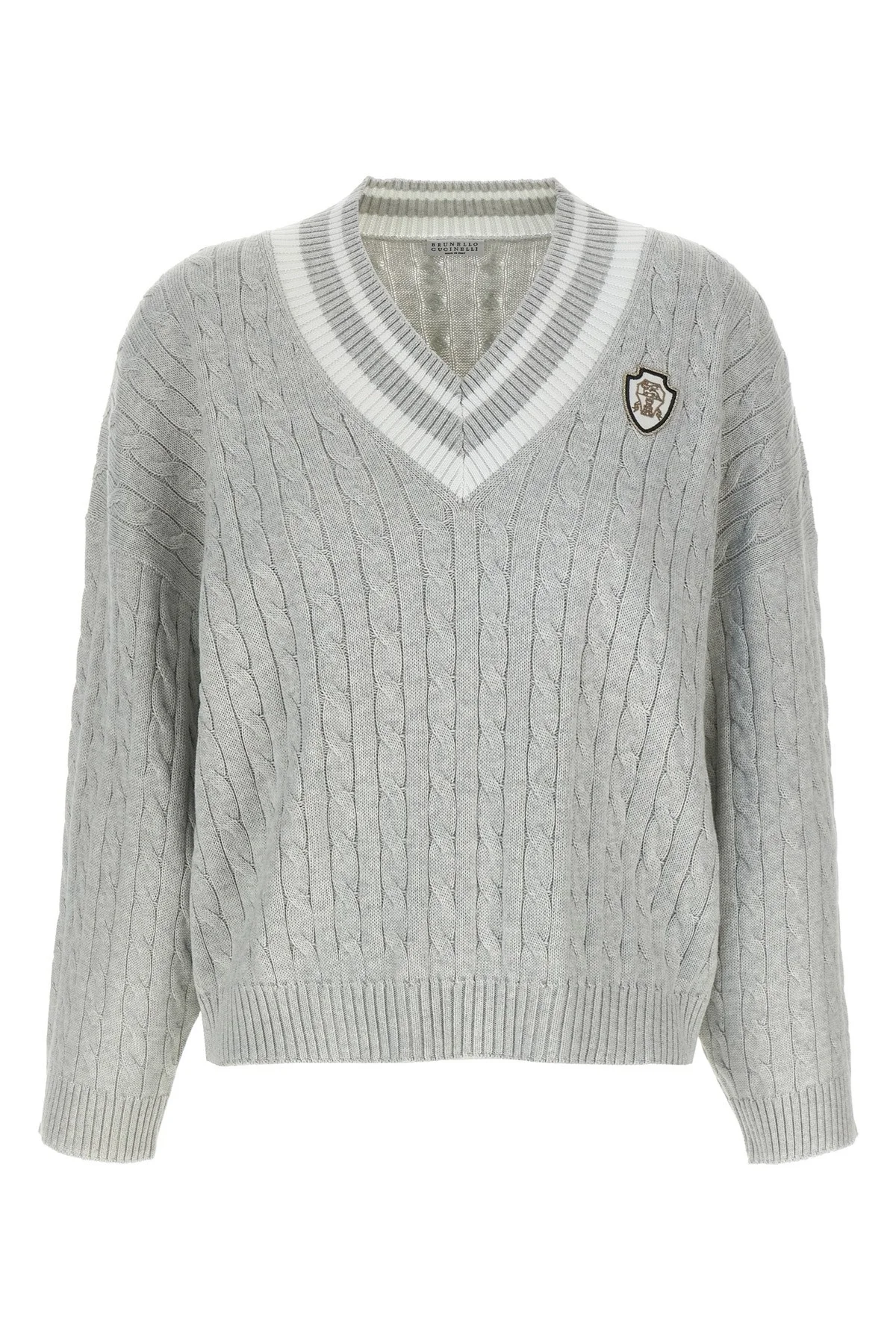 cod. M19756512CV906 Cable knit cotton sweater with contrasting details, front logo patch, V-neck, long sleeves with cuffs, and dropped shoulders. Color: Gray Size & Fit: Comfort fit Composition: 100% cotton Made in: Italy