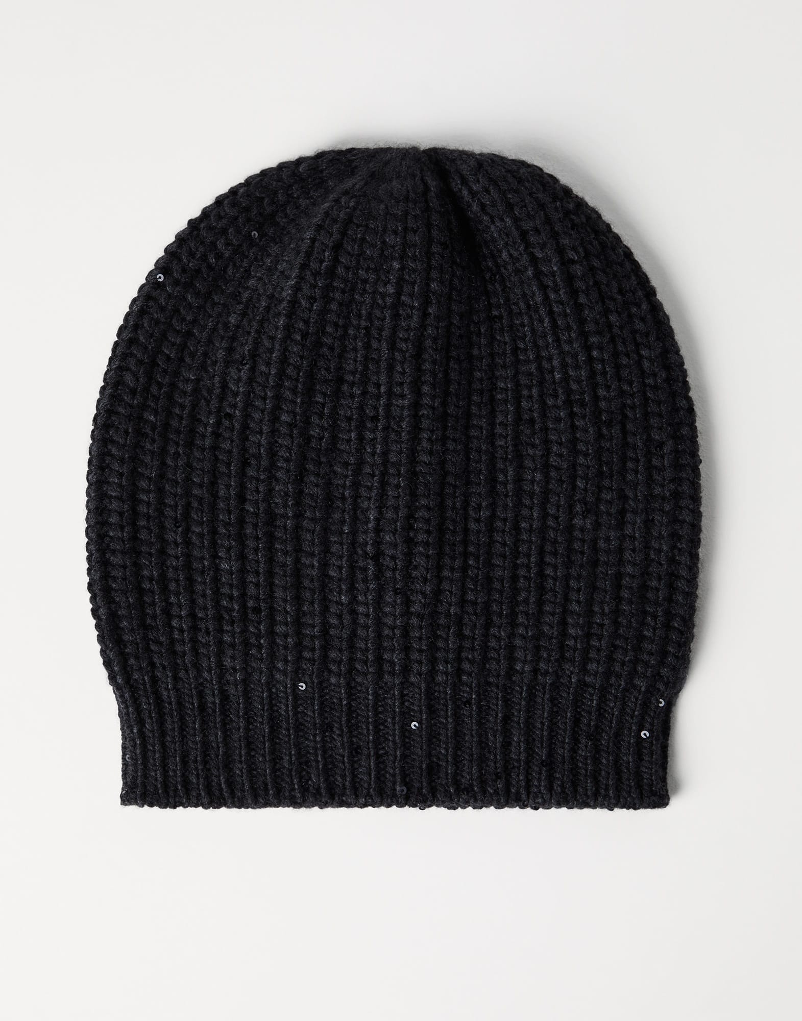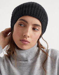 Precious Brunello Cucinelli materials enrich the new beanie. The vaporous texture of the cashmere and silk Diamond yarn enhances the accessory with a precious all-over luminous effect created by the small paillettes inserted into the yarn. MATERIALS The accessory combines the soft, flowing cashmere Feather yarn with the precious cashmere and silk Diamond yarn, characterized by small paillettes that enrich the texture with intense bright reflections. DETAILS Plain stitch 90% CASHMERE, 10% SILK