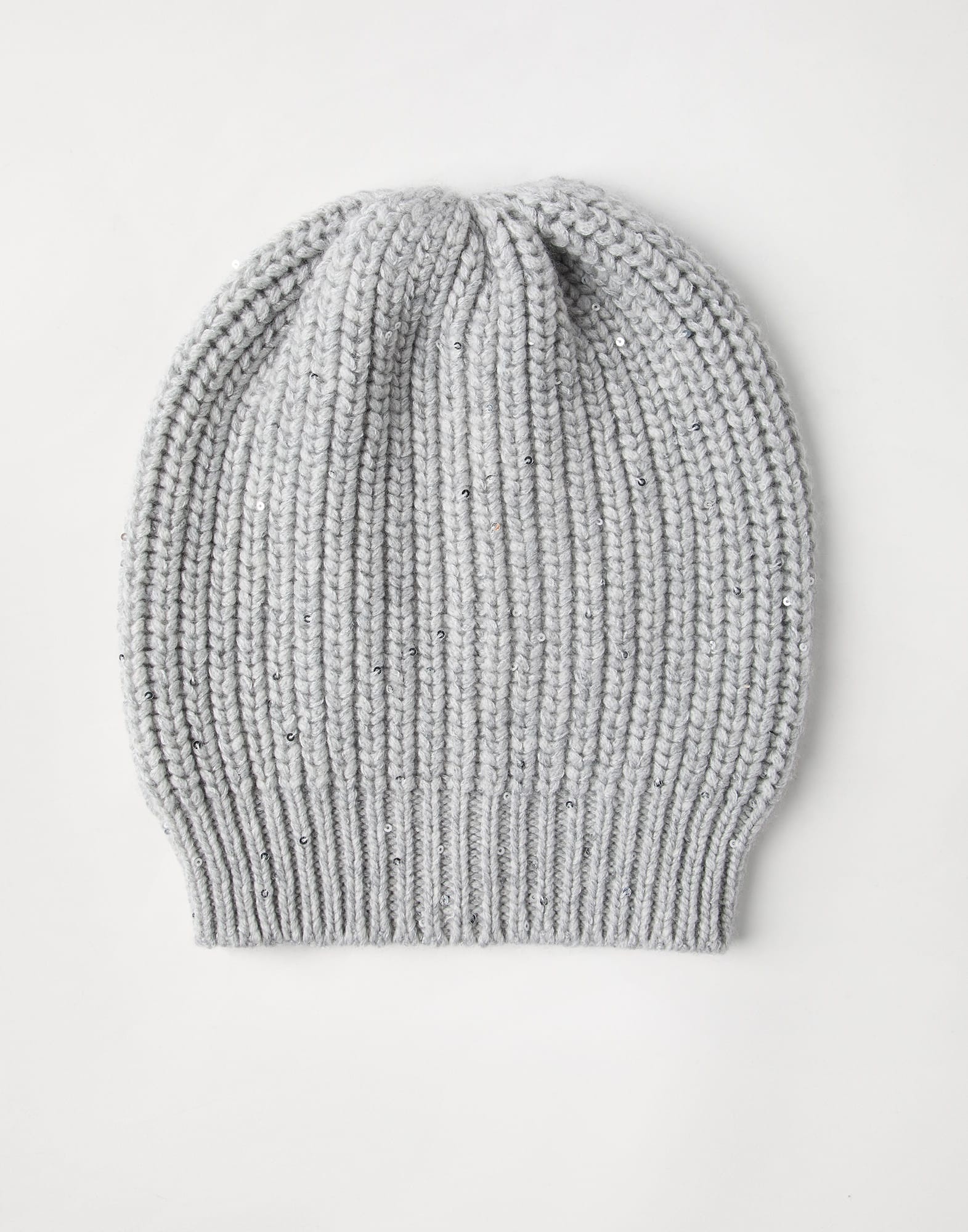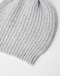 Precious Brunello Cucinelli materials enrich the new beanie. The vaporous texture of the cashmere and silk Diamond yarn enhances the accessory with a precious all-over luminous effect created by the small paillettes inserted into the yarn. MATERIALS The accessory combines the soft, flowing cashmere Feather yarn with the precious cashmere and silk Diamond yarn, characterized by small paillettes that enrich the texture with intense bright reflections. DETAILS Plain stitch 90% CASHMERE, 10% SILK