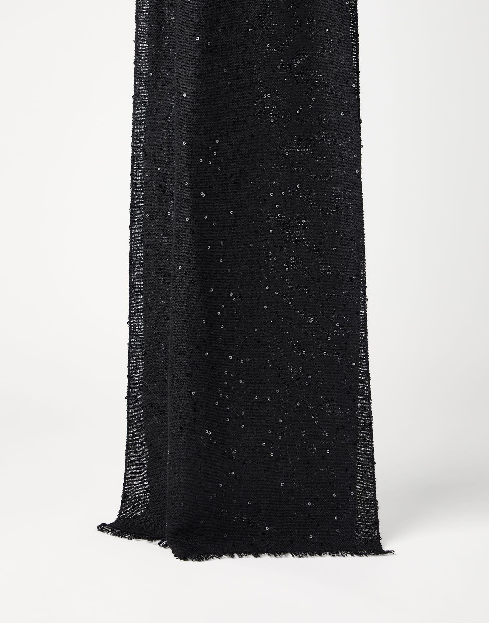 The excellence of Brunello Cucinelli materials and craftsmanship elevate the style of this scarf with a sophisticated touch. Small paillettes enrich the cashmere and silk Diamond yarn’s soft and lightweight texture with precious sparkling reflections. MATERIALS An iconic material of the Brunello Cucinelli collections, Diamond yarn combines the soft, enveloping effects of noble cashmere and silk fibers with sparkling reflections spread by small paillettes incorporated into the yarn. DETAILS Scarf measures approx. 70 cm (27,56") x 200 cm (78,74") 70% CASHMERE, 30% SILK