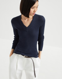 Precious embellishments enrich the essential style of this lightweight cashmere and silk sweater. The lame yarn, with its shiny, metallic reflections, brightens up the cuffs, adding a refined touch that enhances the garment’s feminine feel. Lightweight and cozy, this piece features a close-fitting silhouette, complemented by a classic V-neckline. MATERIALS Single-ply manufacturing enhances the qualities of the cashmere and silk natural fibers to make the yarn soft, lightweight and very comfortable to wear. DETAILS V-neck Regular shoulder Regular sleeve Rib knit 70% CASHMERE, 30% SILK