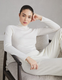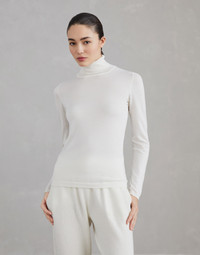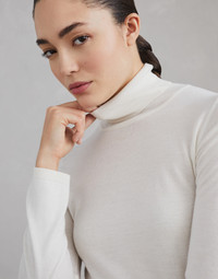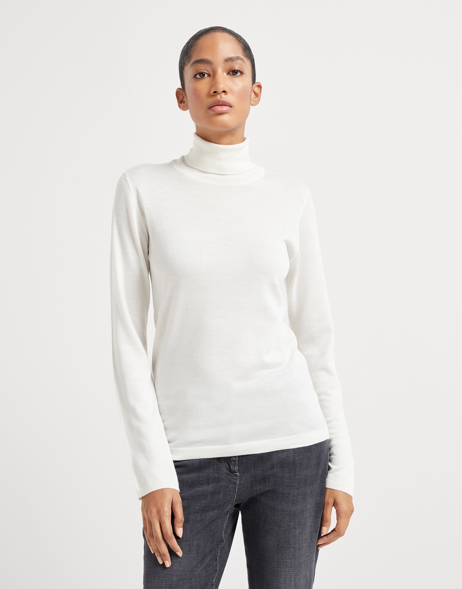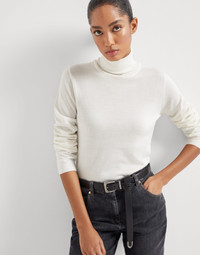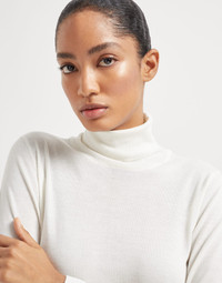 The excellence of Brunello Cucinelli materials enriches the essential shape of the new turtleneck sweater. An ultra lightweight and soft texture of the cashmere and silk yarn combines with the regular fit in both the chest and shoulders which is pleasing to wear. MATERIALS An iconic Brunello Cucinelli material, fine cashmere and silk yarn has been worked to highlight the qualities of both natural materials and make the garment soft, lightweight and an absolute delight to wear. DETAILS High collar Regular shoulder Plain stitch 70% CASHMERE, 30% SILK