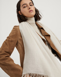 The quality of Brunello Cucinelli materials enhances the style of the scarf with a sophisticated touch. The ulltra-soft, lightweight and slightly transparent effect of the precious cashmere and silk yarn enriches the season’s colors with a delicate effect. MATERIALS An iconic Brunello Cucinelli material, fine cashmere and silk yarn has been worked to highlight the qualities of both natural materials and make the garment soft, lightweight and an absolute delight to wear. DETAILS Short side with fringe Scarf measures approx. 100 cm x 200 cm 95% CASHMERE, 5% SILK