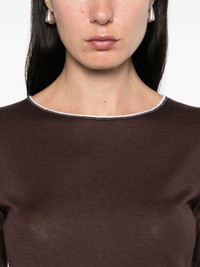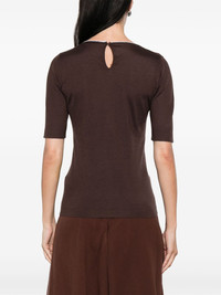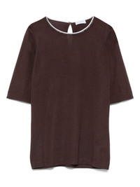 short sleeve T-shirt Highlights - Brown - Crew neck - Short sleeves - Contrasting collar - Straight hem Made in Italy Composition Cashmere 70%, Silk 30% SIZE & FIT Model measurements Height 5 ft 10 in(1.78 m) Bust/Chest 33.46 in(85 cm) Hips 36.22 in(92 cm) Waist 23.22 in(59 cm) Washing instructions Hand Wash
