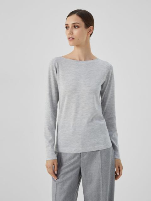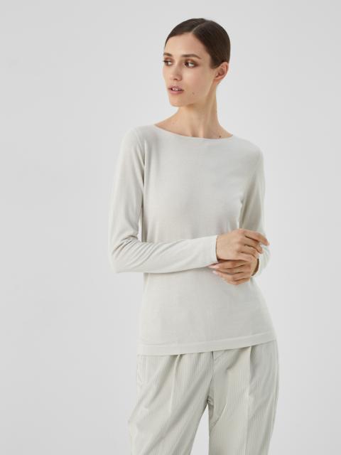 Refined Brunello Cucinelli materials elevate the essential and feminine style of this new cashmere and silk sweater. The yarn’s lightweight and extremely soft texture pairs perfectly with the silhouette, characterized by fitted lines to the body in the bust and the shoulders. MATERIALS Cashmere and silk fibers are manufactured together with a fine lame thread to enrich the texture with delicate metallic reflections. The presence of a synthetic fiber provides added comfort. DETAILS Wide neckline Regular shoulder Regular sleeve Plain stitch 51% CASHMERE, 22% SILK, 20% NYLON, 7% POLYESTER
