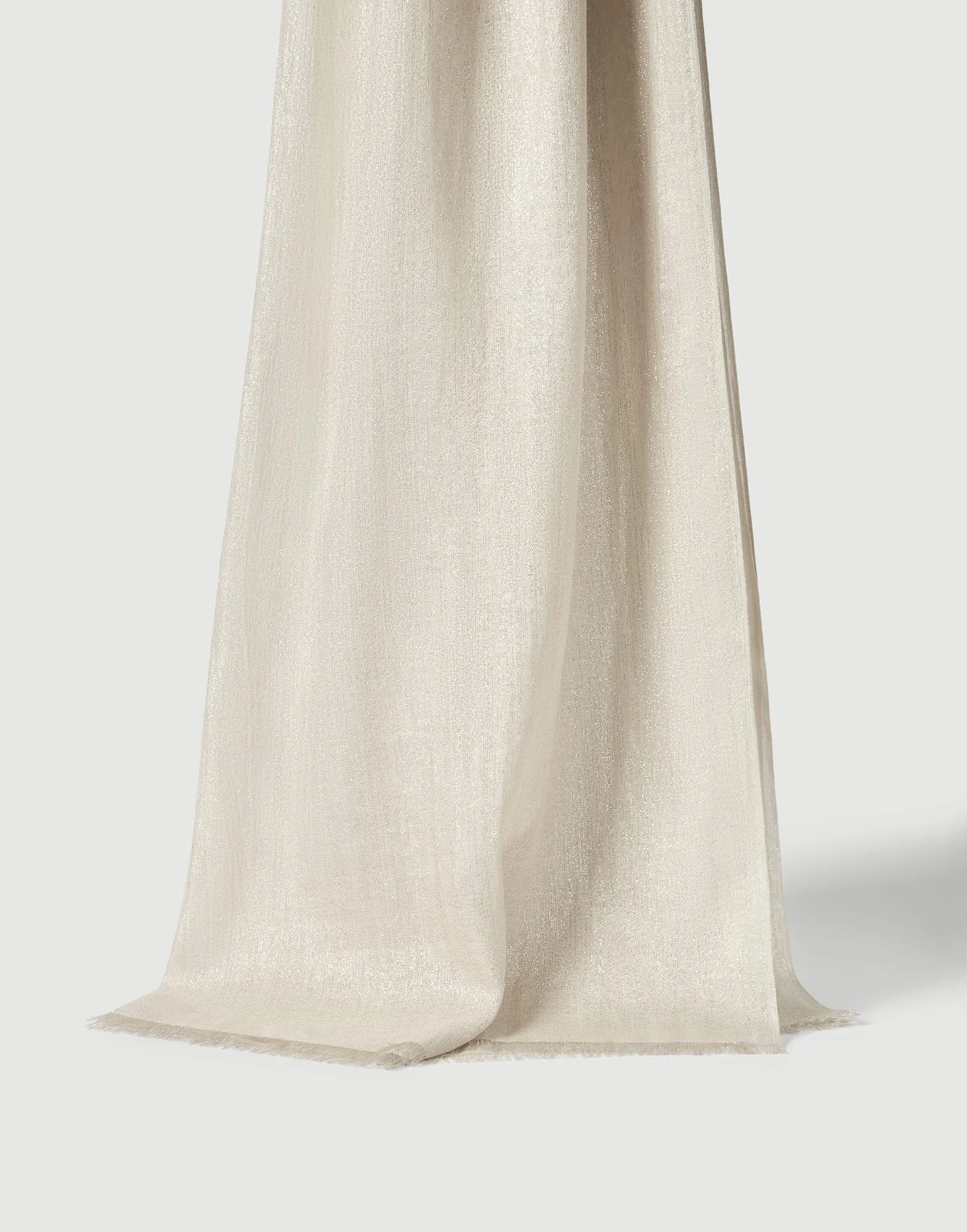 The quality of Brunello Cucinelli materials lends an elegant touch to the scarf. Sparkling reflections spread by the lame thread blend with the noble natural fibers’ soft and enveloping effect. MATERIALS The refined fabric combines the qualities of the cashmere and silk fibers with an extra fine lame yarn to spread sparkling reflections along the surface of the accessory. DETAILS Short side with fringe Scarf measures approx. 90 cm (35,43") x 120 cm (47,24") 55% CASHMERE, 33% SILK, 12% NYLON