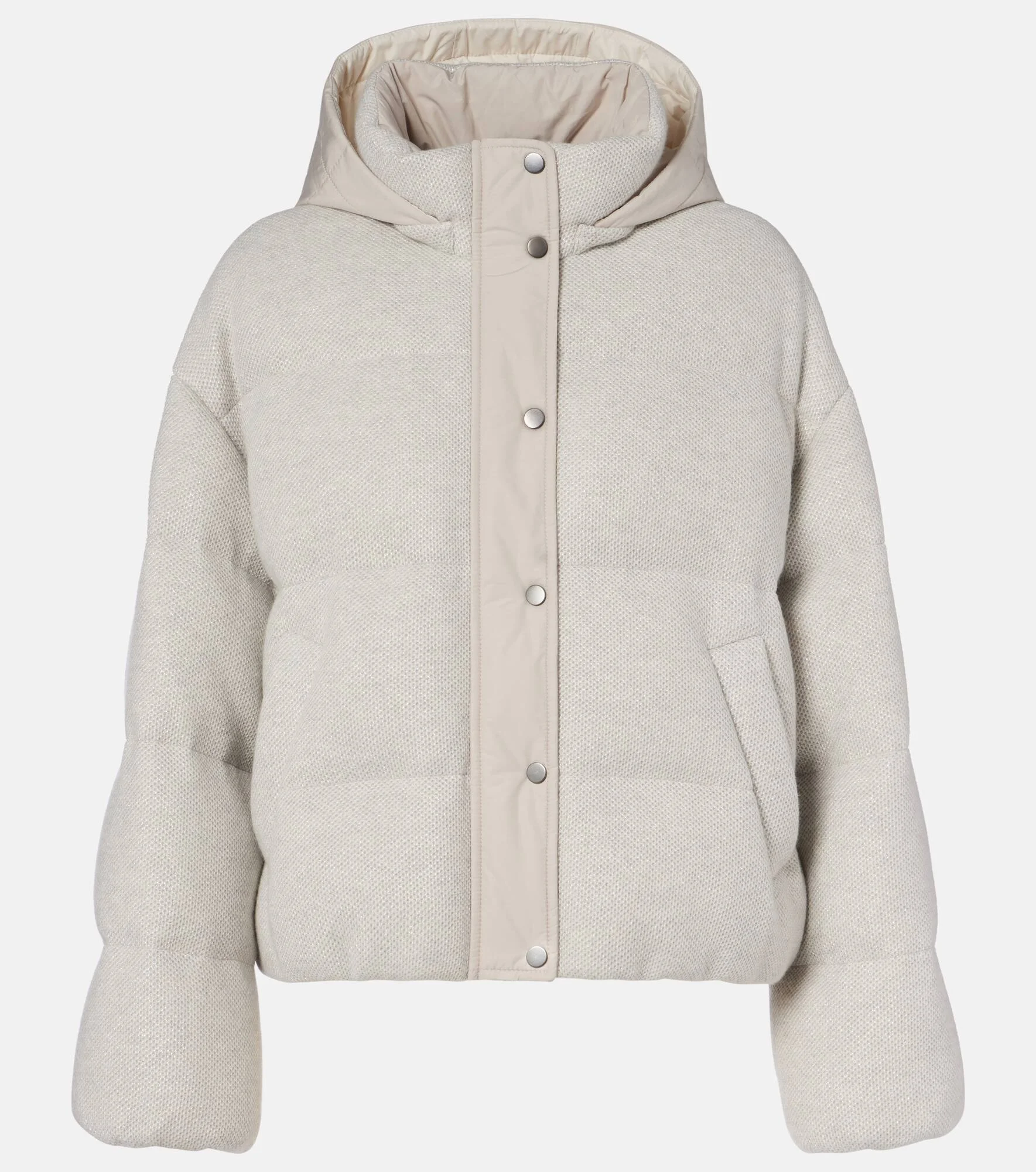 Supreme softness characterizes Brunello Cucinelli's cashmere pieces, which are produced in Italy from the finest fibers. This down jacket provides warmth and style with its cashmere exterior, complete with a detachable hood and a drawstring hem for a customizable fit. Product Details - Material: 76% cashmere, 18% viscose, 6% polyester - Care instructions: dry clean - Made in Italy - Designer color name: Nebbia + Platino - Item color: gray, beige - Material II: 55% polyester, 45% cotton - Separate lining slip: 100% polyamide - Filling: 90% down, 10% feathers - Filling II: 100% polyester - Insert: 100% brass - Contains non-textile parts of animal origin - Closure: two-way zipped front with snap-button fastenings - Detachable hood - Cuff: elasticated - Pockets: slant pockets - Drawstring at the hem for adjustable fit - Item number: P01091781 Size & Fit - True to size - Dropped shoulders - Designed for a loose fit - Non-stretchy fabric - Falls to the hip - Height of model is 175cm-69" and wears a size IT 40