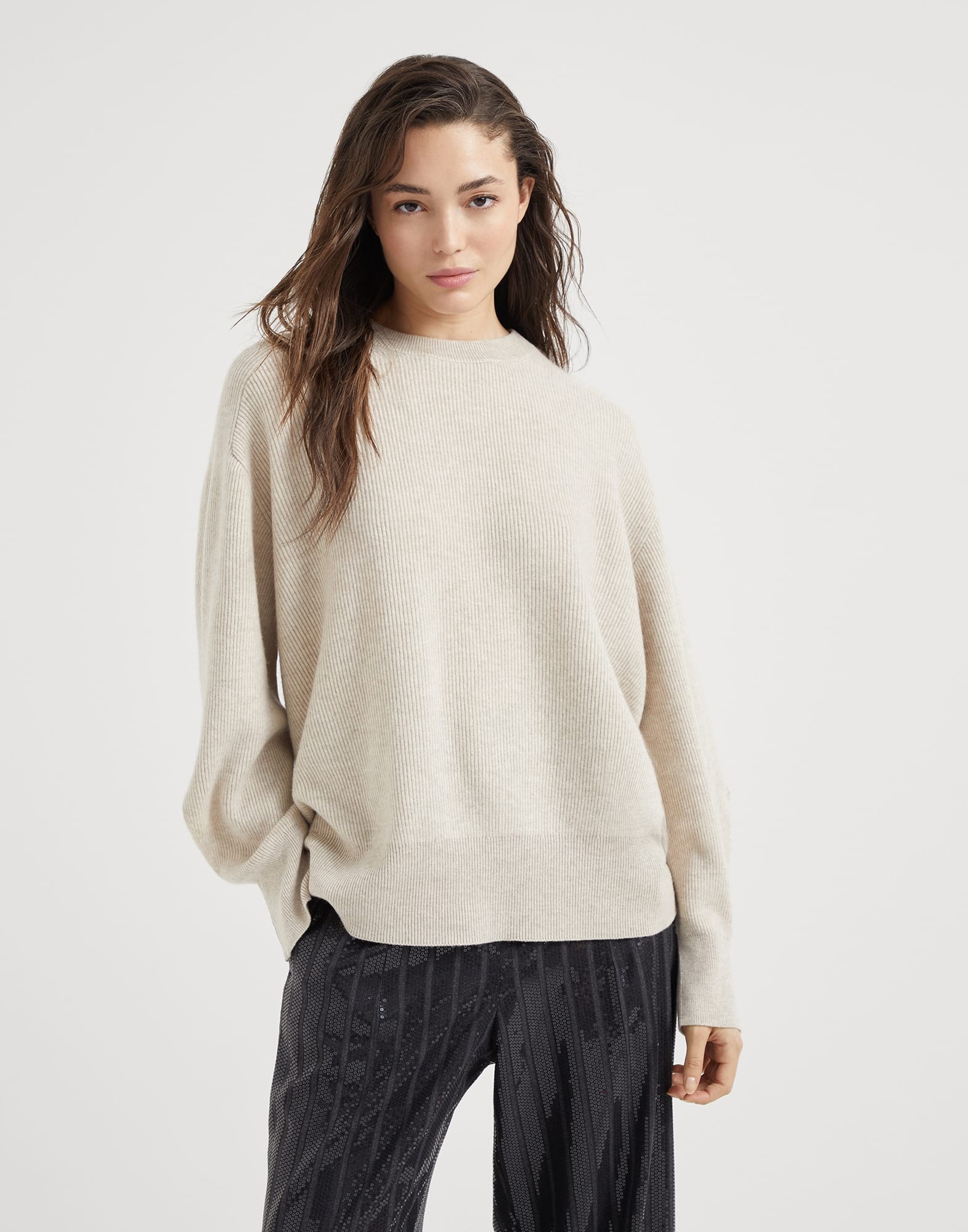 The timeless look of English rib knitting is paired with the iconic embellishment of the Brunello Cucinelli collections in this new cashmere sweater. The soft lines and the slightly dropped shoulders define the garment's relaxed fit. The edge of the sleeves is enriched with a fine monili embroidery, adding a delicate feminine sparkle. MATERIALS The noble cashmere fiber is characterized by an extreme fineness and also for its precious insulating qualities which guarantee warmth, providing coverage and lightness when worn. DETAILS Crew-neck Drop shoulder Wide sleeve English rib Nickel-free monili decoration 100% CASHMERE