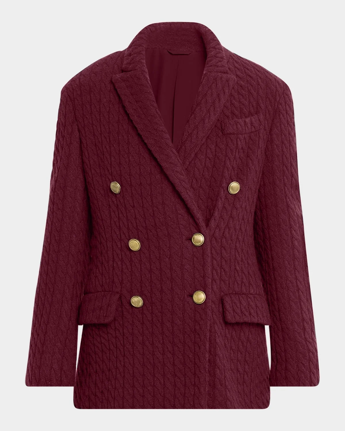 - Brunello Cucinelli blazer in cable knit with goldtone buttons - Peak lapels; double-breasted front - Long sleeves; button cuffs - Chest welt pocket - Hip flap pockets - Straight fit - Hem falls below the hip - Center-back vented hem - Cashmere - Lining: Acetate/silk/polyester - Dry clean - Made in Italy