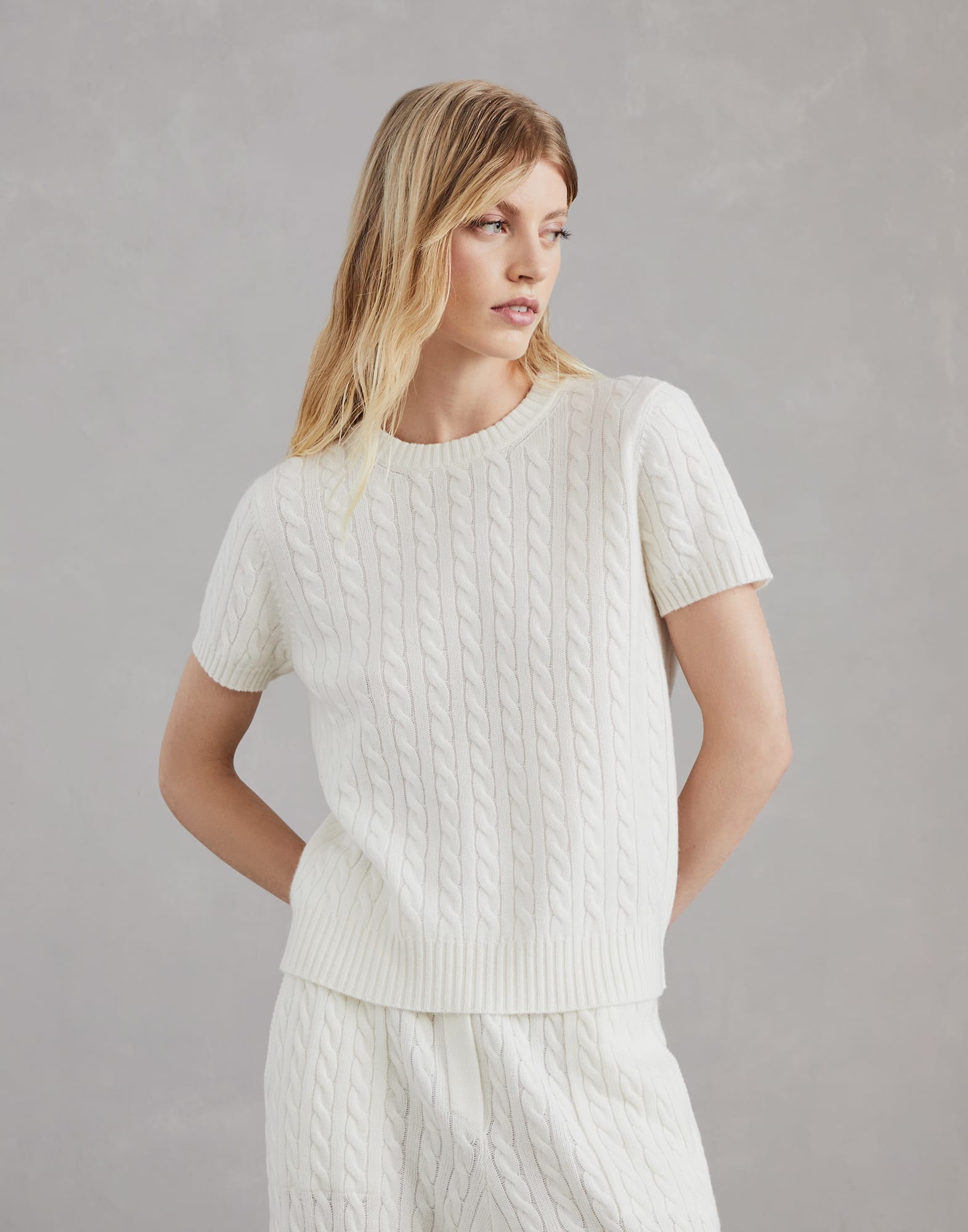 Refined Brunello Cucinelli materials elevate the versatile style of this short sleeve sweater. The timeless cable knitting enhances the pure cashmere yarn and gives the garment a soft look. Completed with a crew-neck and ribbed trim, the sweater features a regular, slightly fitted silhouette. MATERIALS The noble cashmere fiber is characterized by an extreme fineness and also for its precious insulating qualities which guarantee warmth, providing coverage and lightness when worn. DETAILS Crew-neck Regular shoulder Regular sleeve Cable knit 100% CASHMERE