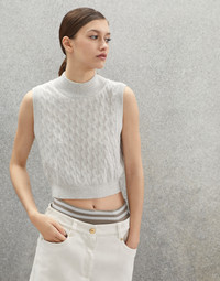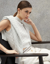 Premium materials and contemporary lines elevate the classic flair of this vest. The menswear inspirations of cable knitting are combined with the refined feel of the soft pure cashmere yarn, characterized by a lightweight yet cozy texture. A fine shiny monili embroidery behind the neck adds a precious note. The fit offers regular proportions with a slightly cropped design. MATERIALS The noble cashmere fiber is characterized by an extreme fineness and also for its precious insulating qualities which guarantee warmth, providing coverage and lightness when worn. DETAILS High collar Cable knit Cropped hem Nickel-free monili decoration 100% CASHMERE