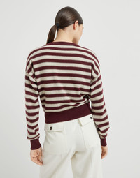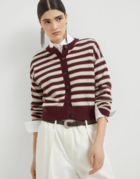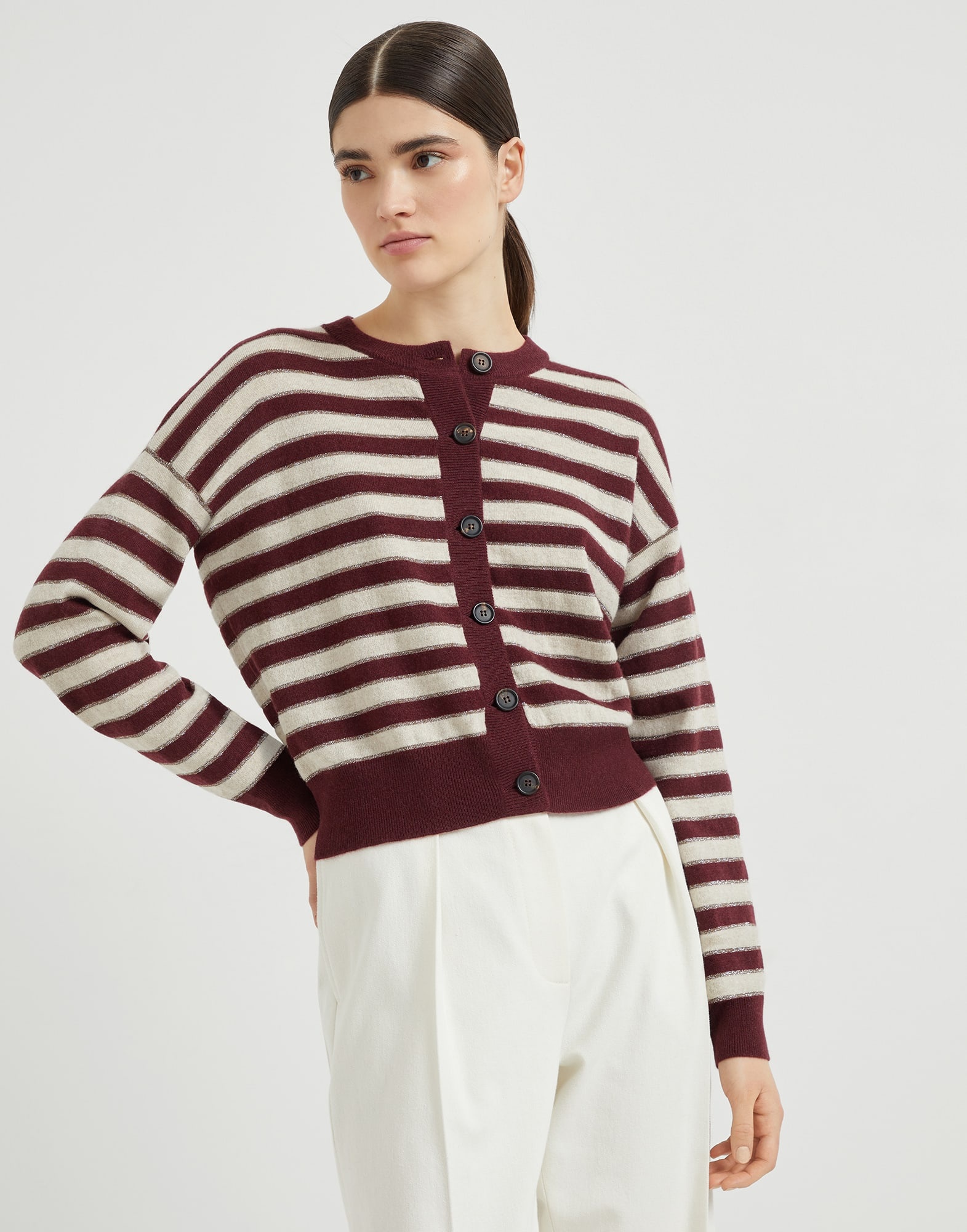 Touches of shine and color enrich the striped pattern of this cashmere cardigan with sparkling stripes. The surface alternates stripes with metallic reflections spread by the lame thread with other stripes in the season’s colors. The silhouette features a button closure, a classic crew-neck and comfortable proportions with dropped shoulders and sleeves with a slight “balloon” effect. MATERIALS The noble cashmere fiber is characterized by an extreme fineness and also for its precious insulating qualities which guarantee warmth, providing coverage and lightness when worn. DETAILS Horn button closure Crew-neck Drop shoulder Wide sleeve Plain stitch 100% CASHMERE