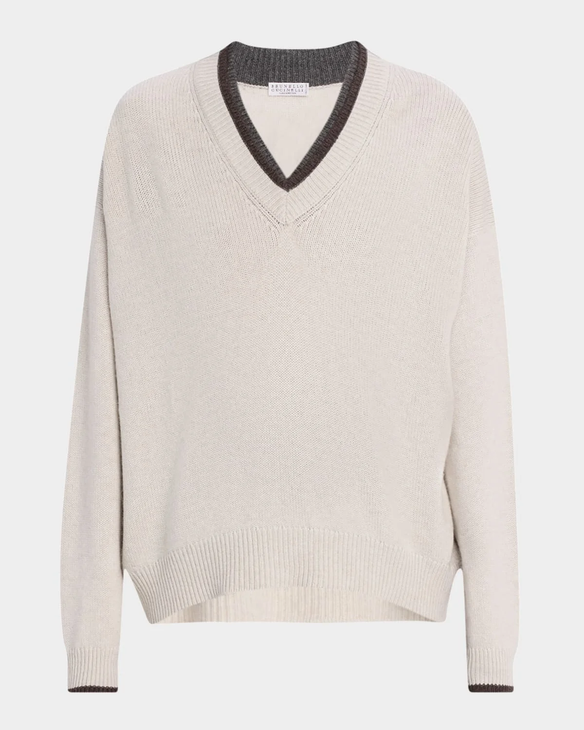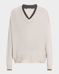 - Brunello Cucinelli luxurious cashmere sweater decorated with two-tone striped trim - V neckline - Long sleeves with ribbed cuffs - Relaxed fit - Ribbed hem - Pullover style - Cashmere - Made in Italy