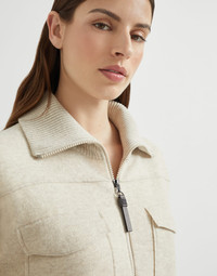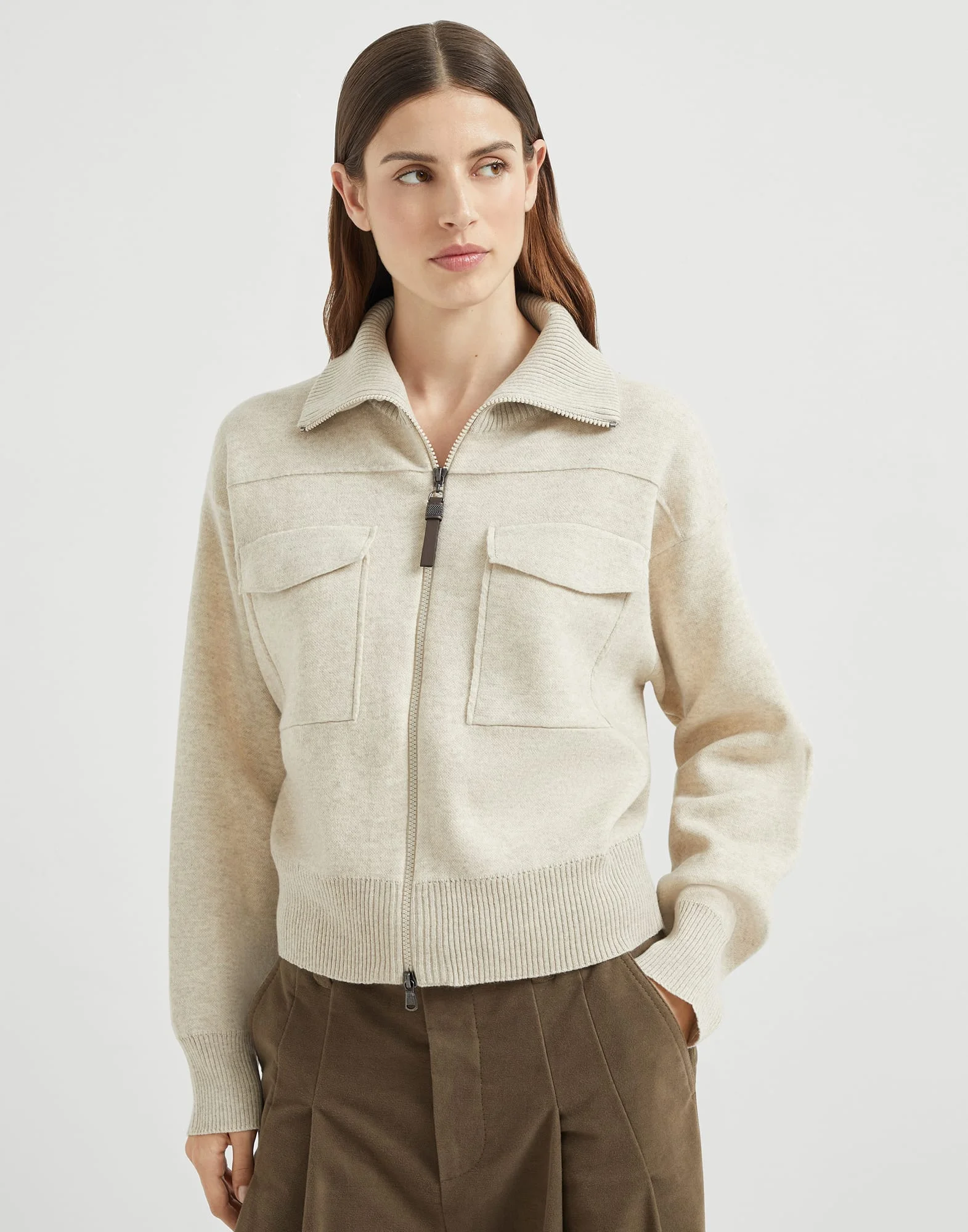 Cashmere double knit enriches the casual style of this new cardigan thanks to the precious qualities of the natural fiber. The style uses artisanal craftsmanship that combines two very thin layers of knitting, making wearing comfortable and cozy. The high neck and pockets on the front add functional, sporty elements, while an elegant embroidery of fine rows of shiny monili enriches the zipper pull with a feminine sparkle in true Brunello Cucinelli style. MATERIALS Manufacturing of the refined pure cashmere combines two layers of soft knit to enhance the precious qualities of the natural fiber. Ultra-soft and warm, the garment maintains a balanced weight to offer the right amount of protection. DETAILS Two-way zip closure High collar Drop shoulder Wide sleeve Two patch chest pockets with flap Special workmanship Nickel-free monili decoration 96% CASHMERE, 3% NYLON, 1% ELASTANE