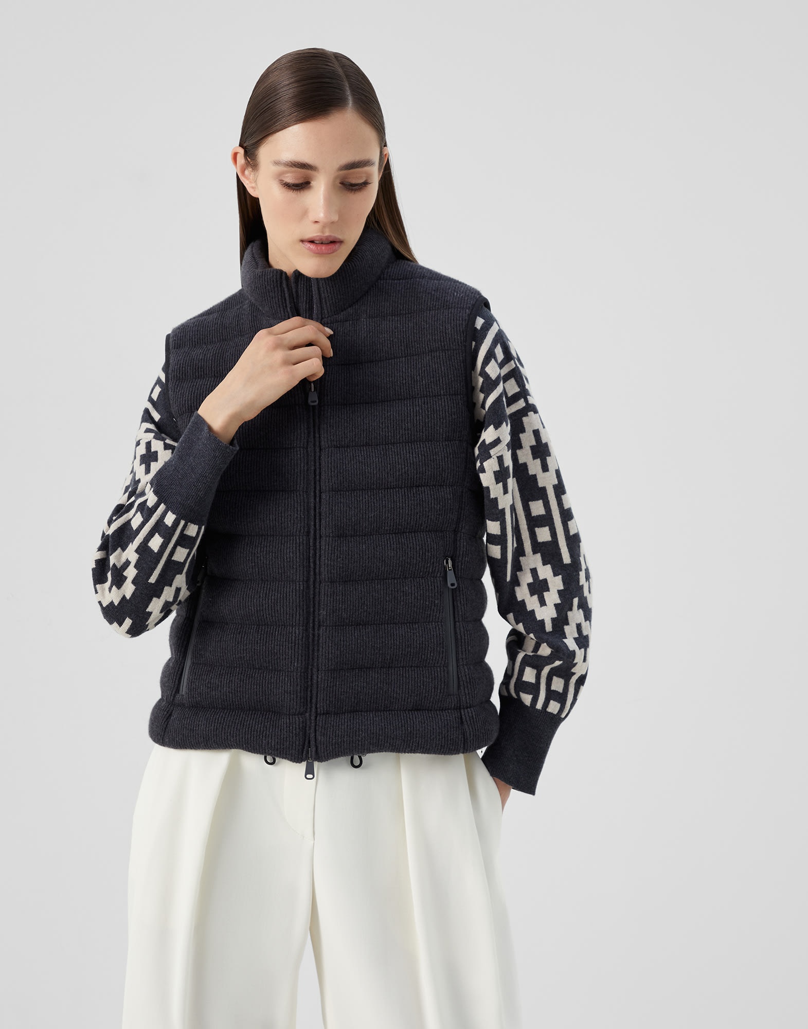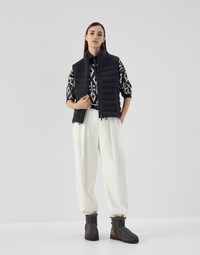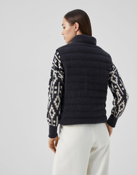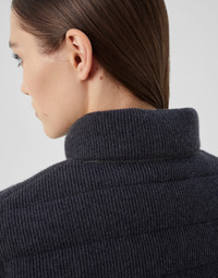 Pure cashmere knitting meets the sporty nature of the down vest and is adorned with timeless feminine details. This garment’s versatile feel is enriched with the qualities of the refined natural fiber, crafted as a thin and very lightweight English rib knit fabric. Soft high-quality padding provides added comfort, while a fine shiny monili embroidery illuminates the back of the neck with a sparkling touch. MATERIALS The noble cashmere fiber is characterized by an extreme fineness and also for its precious insulating qualities which guarantee warmth, providing coverage and lightness when worn. DETAILS Two-way zip closure Water-resistant nylon lining Hand pockets with zipper Drawstring hem Padding made from high-quality natural materials: 90% goose down, 10% goose feathers English rib Nickel-free monili decoration 100% CASHMERE