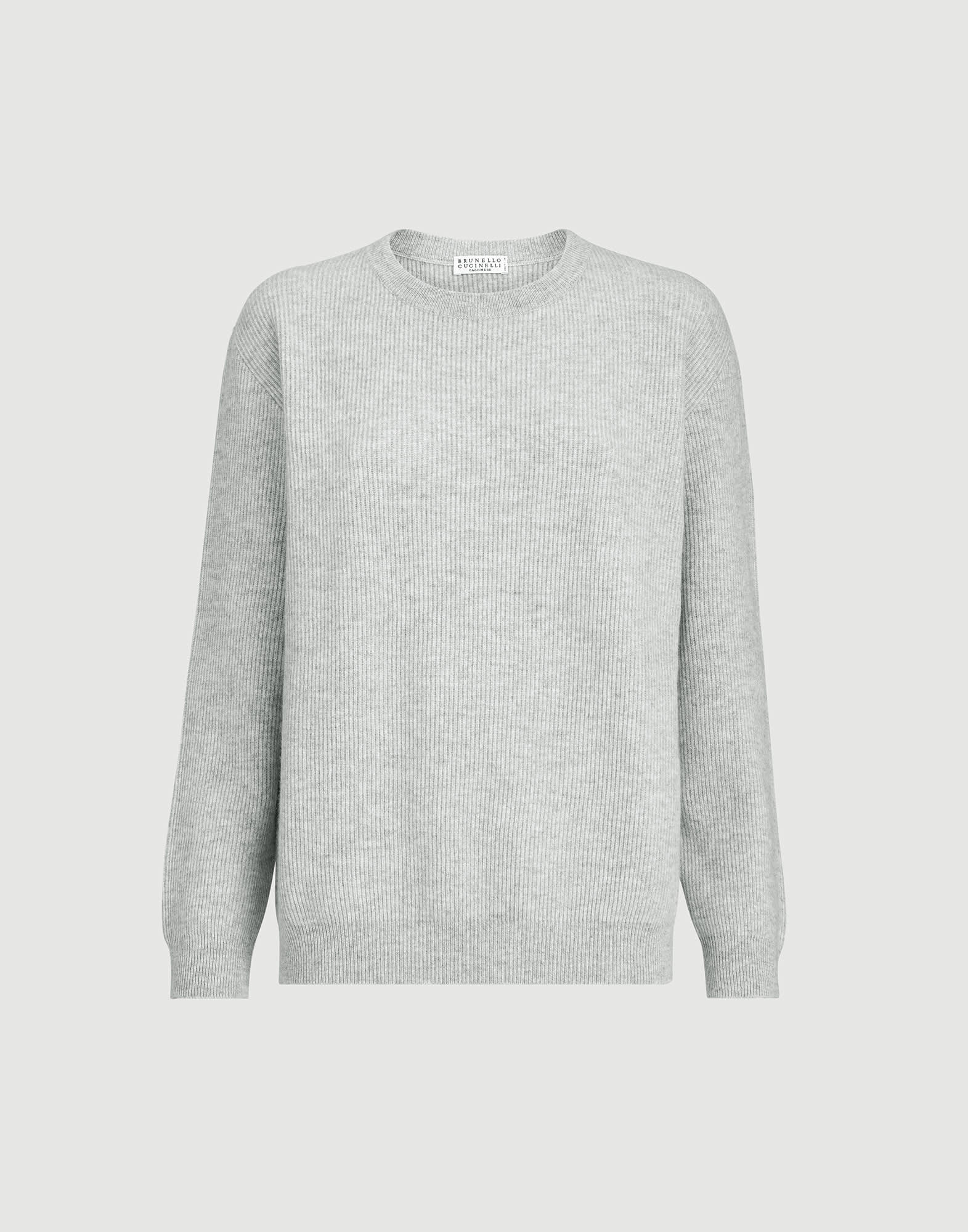 Cozy and timeless style characterizes this new cashmere sweater. Its English rib knitting emphasizes the soft, comfortable look of this piece. Behind the neck, a shiny monili embroidery stands out, adding a delicate sparkling note created by a sophisticated embellishment in true Brunello Cucinelli style. MATERIALS The noble cashmere fiber is characterized by an extreme fineness and also for its precious insulating qualities which guarantee warmth, providing coverage and lightness when worn. DETAILS Crew-neck Drop shoulder English rib Nickel-free monili decoration 100% CASHMERE