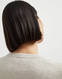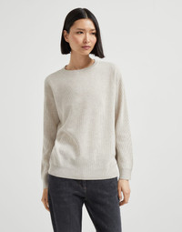 Cozy and timeless style characterizes this new cashmere sweater. Its English rib knitting emphasizes the soft, comfortable look of this piece. Behind the neck, a shiny monili embroidery stands out, adding a delicate sparkling note created by a sophisticated embellishment in true Brunello Cucinelli style. MATERIALS The noble cashmere fiber is characterized by an extreme fineness and also for its precious insulating qualities which guarantee warmth, providing coverage and lightness when worn. DETAILS Crew-neck Drop shoulder English rib Nickel-free monili decoration 100% CASHMERE