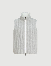 Precious materials and details enhance the sporty and versatile flavor of the down vest. The reversibility makes the garment functional and makes the most of the materials: on the exterior, English Rib knit soft cashmere Feather yarn is paired with the lightweight taffeta back. The interior showcases lightweight nylon. Along the zipper closure, fine rows of monili embroidery enriches the garment with a shiny touch. MATERIALS The lightweight pure cashmere Feather yarn is characterized by an extremely soft hand. A compact and voluminous texture makes the yarn warm and cozy. The reversible side showcases lightweight nylon: a finish provides added resistance to the slightest contact with water. DETAILS Two-way zip closure High collar Hand pockets with snap *Reversible side* Water-resistant nylon lining Thermore® padding Nickel-free monili decoration 100% CASHMERE
