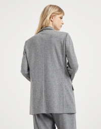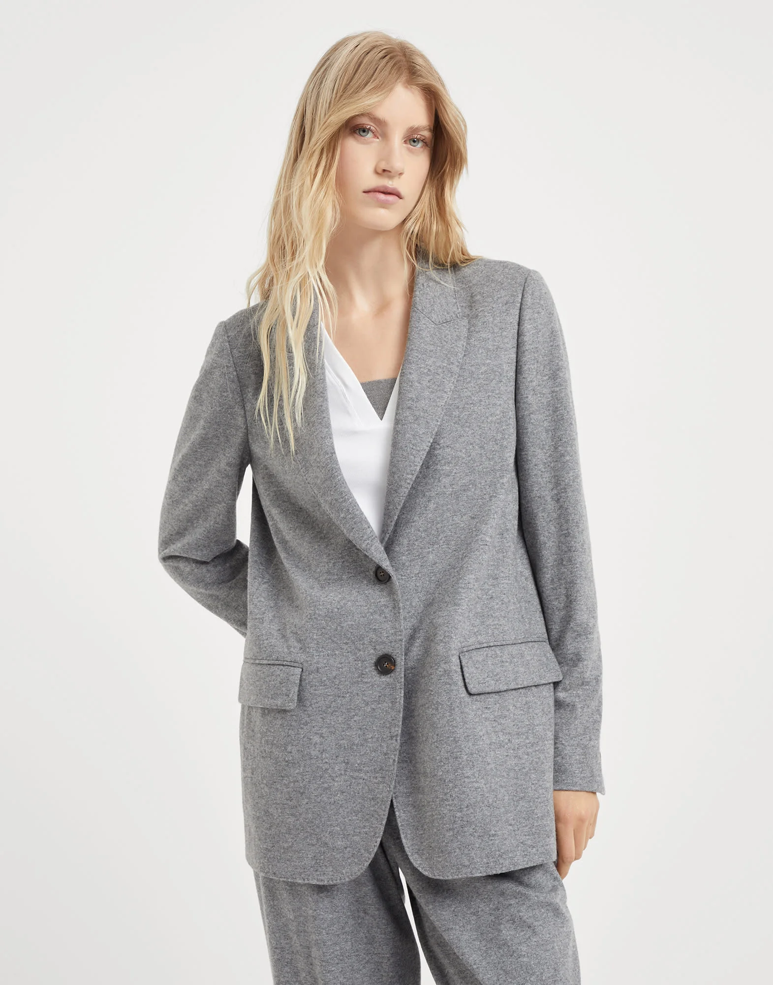 Fluid, cozy and precious, this new unconstructed cashmere jersey blazer is ideal for adding style to this season’s looks. The classic details of the peak lapel and the flap pockets stand out against the piece’s compact texture. The fabric’s soft hand is paired with a slightly tapered fit with close lines to the body. A precious monili embroidery runs along the back of the collar, adding an unexpected sparkling note to the blazer. MATERIALS Jersey, the ultimate casual fabric, is combined with the precious natural fiber of cashmere. This new fabric is smooth, compact, soft and at the same time cozy. DETAILS Horn button closure Half-lined in cupro Hand pockets with flap Nickel-free monili decoration 100% CASHMERE