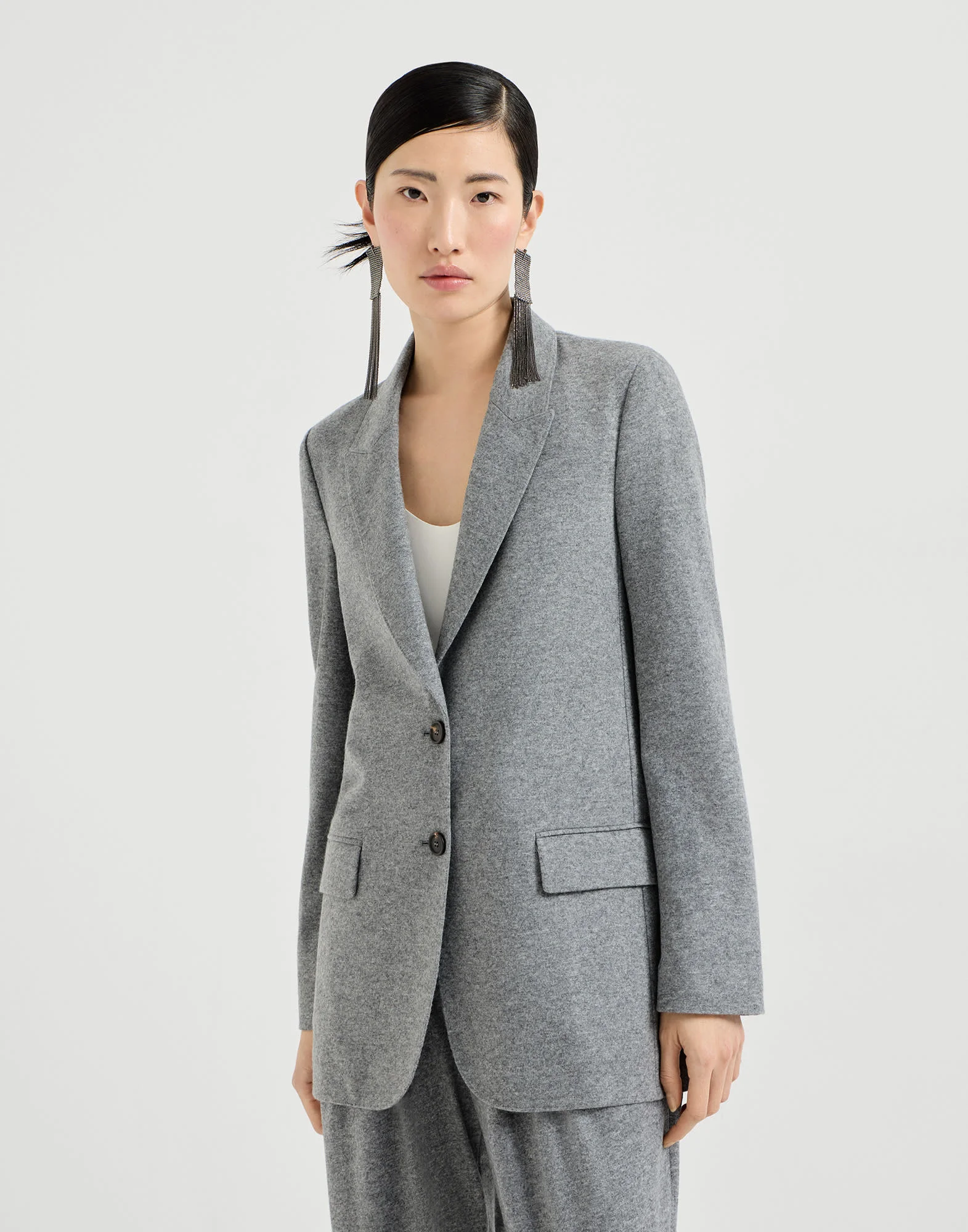 Fluid, cozy and precious, this new unconstructed cashmere jersey blazer is ideal for adding style to this season’s looks. The classic details of the peak lapel and the flap pockets stand out against the piece’s compact texture. The fabric’s soft hand is paired with a slightly tapered fit with close lines to the body. A precious monili embroidery runs along the back of the collar, adding an unexpected sparkling note to the blazer. MATERIALS Jersey, the ultimate casual fabric, is combined with the precious natural fiber of cashmere. This new fabric is smooth, compact, soft and at the same time cozy. DETAILS Horn button closure Half-lined in cupro Hand pockets with flap Nickel-free monili decoration 100% CASHMERE