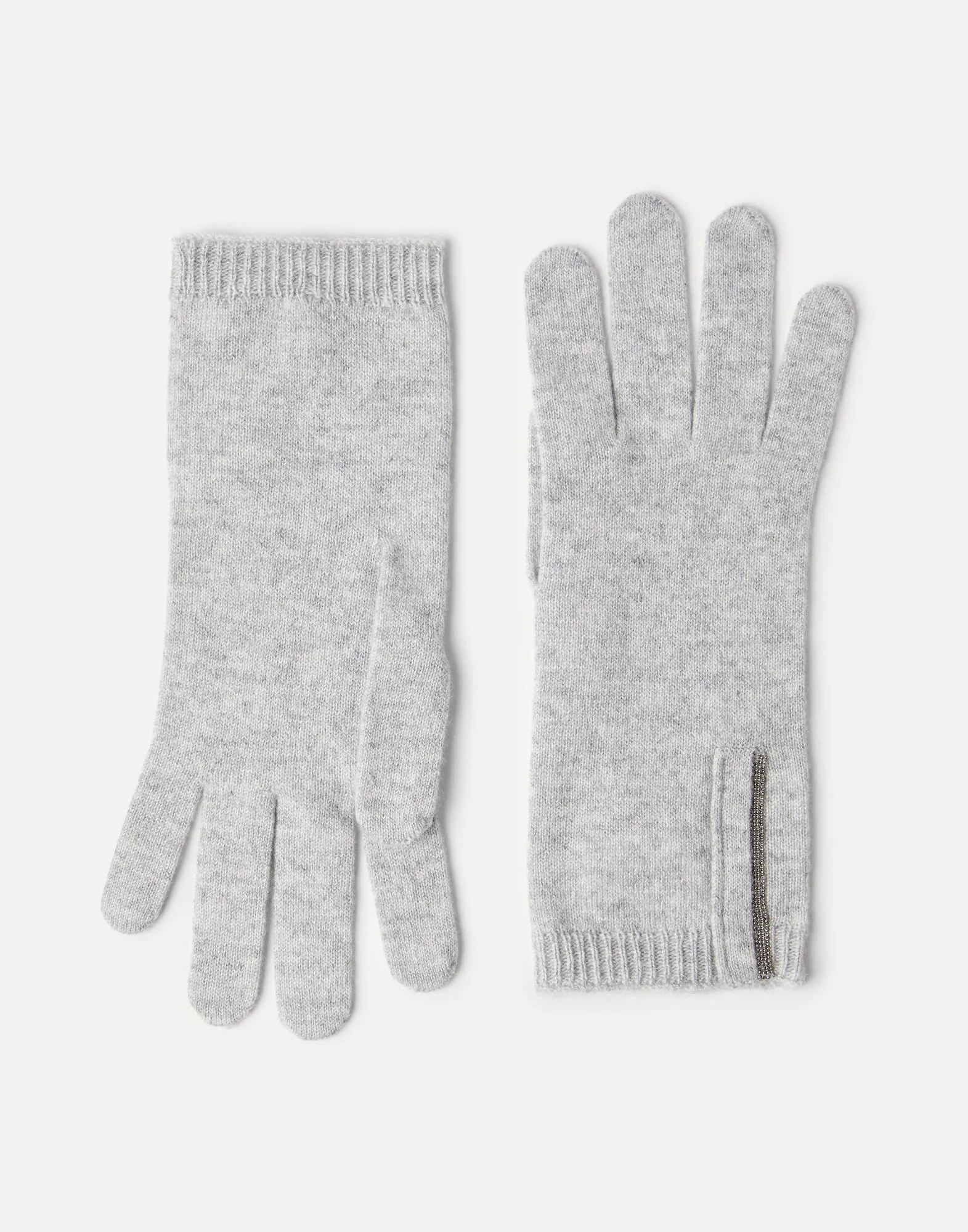 Refined pure cashmere yarn adds an elegant touch to these gloves, which are perfect for complementing a winter look with a sophisticated note. A band made of embroidered shiny monili rows completes the accessories with a precious detail in true Brunello Cucinelli style. MATERIALS The noble cashmere fiber is characterized by an extreme fineness and also for its precious insulating qualities which guarantee warmth, providing coverage and lightness when worn. DETAILS Plain stitch Nickel-free monili decoration 100% CASHMERE