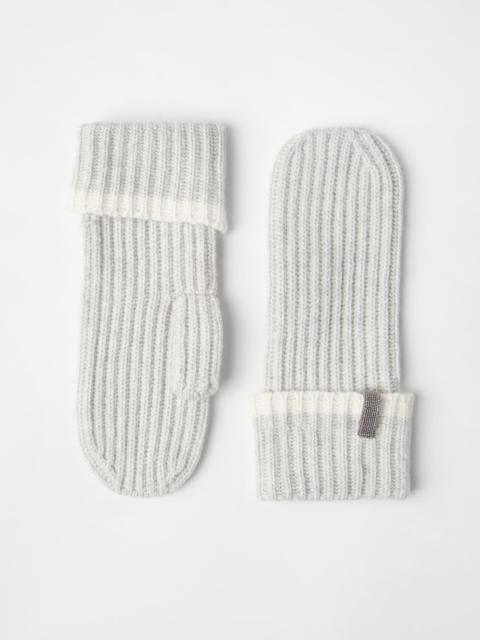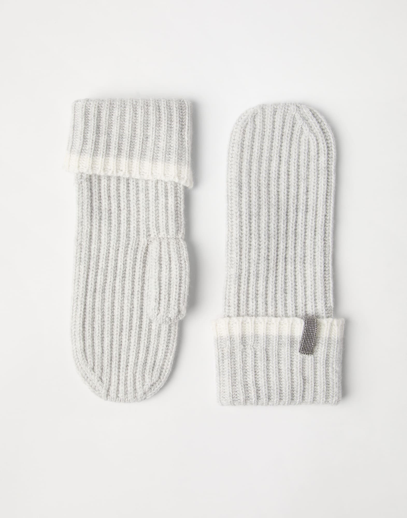 Noble Brunello Cucinelli fibers enrich these cashmere knit mittens. Timeless English rib knitting enhances the soft yarn and emphasizes the accessory’s exquisitely wintry feel. The shiny monili detail adds a feminine sparkle. MATERIALS The noble cashmere fiber is characterized by an extreme fineness and also for its precious insulating qualities which guarantee warmth, providing coverage and lightness when worn. DETAILS Rib knit Nickel-free monili decoration 100% CASHMERE
